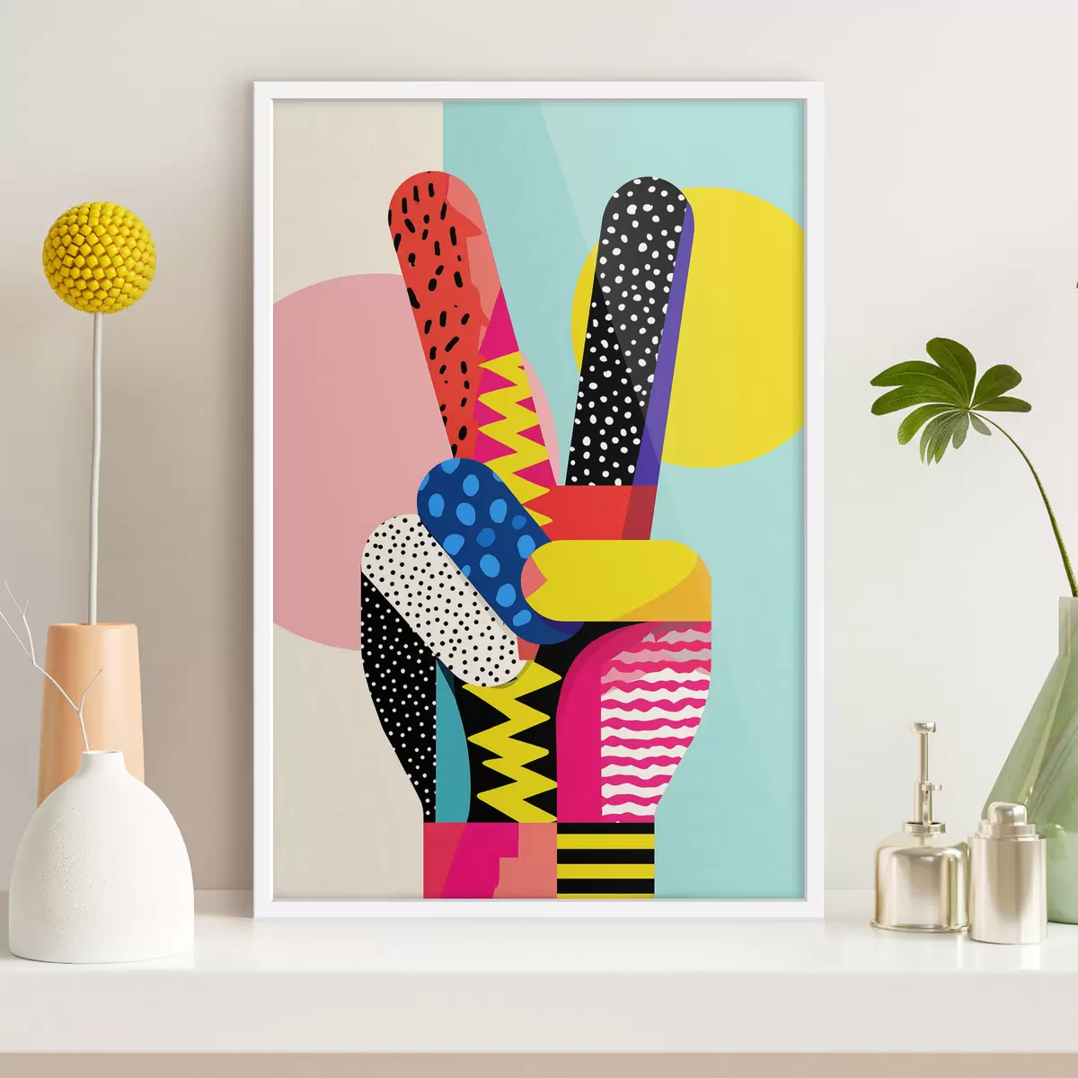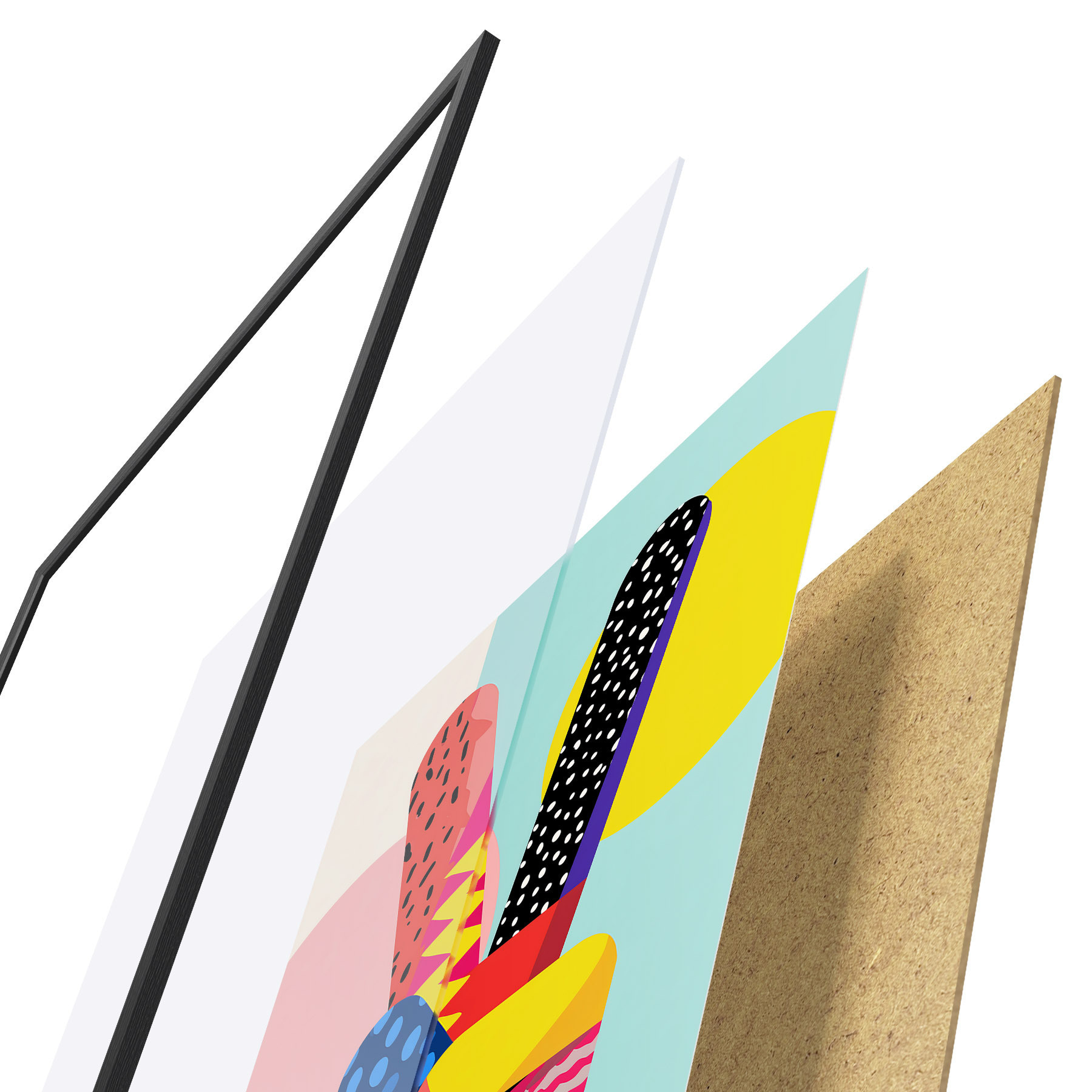 De poster bestaat uit een frame, plexiglas, geprinte afbeelding en spaanplaat achterkant. De poster kan meteen aan de muur worden gehangen dankzij de bevestigingen op de achterkant.
