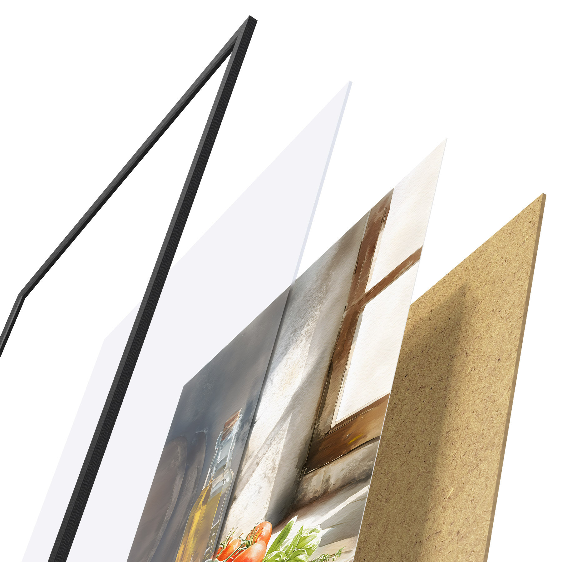De poster bestaat uit een frame, plexiglas, geprinte afbeelding en spaanplaat achterkant. De poster kan meteen aan de muur worden gehangen dankzij de bevestigingen op de achterkant.