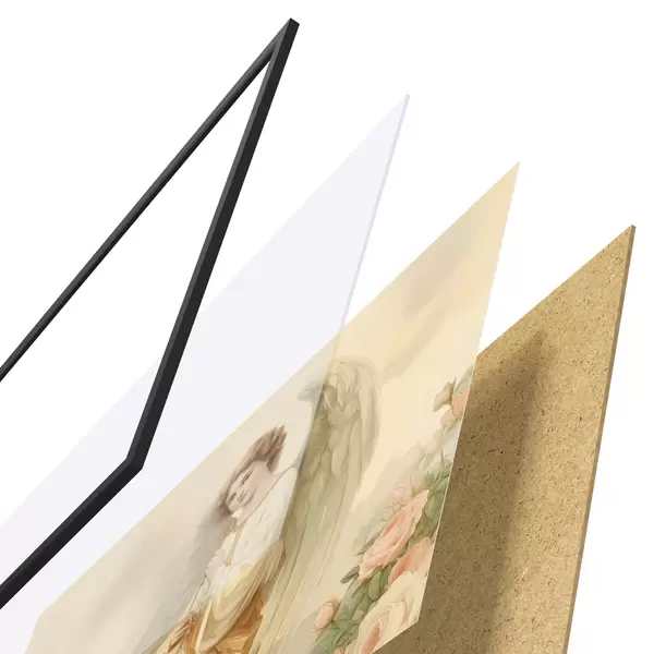 De poster bestaat uit een frame, plexiglas, geprinte afbeelding en spaanplaat achterkant. De poster kan meteen aan de muur worden gehangen dankzij de bevestigingen op de achterkant.