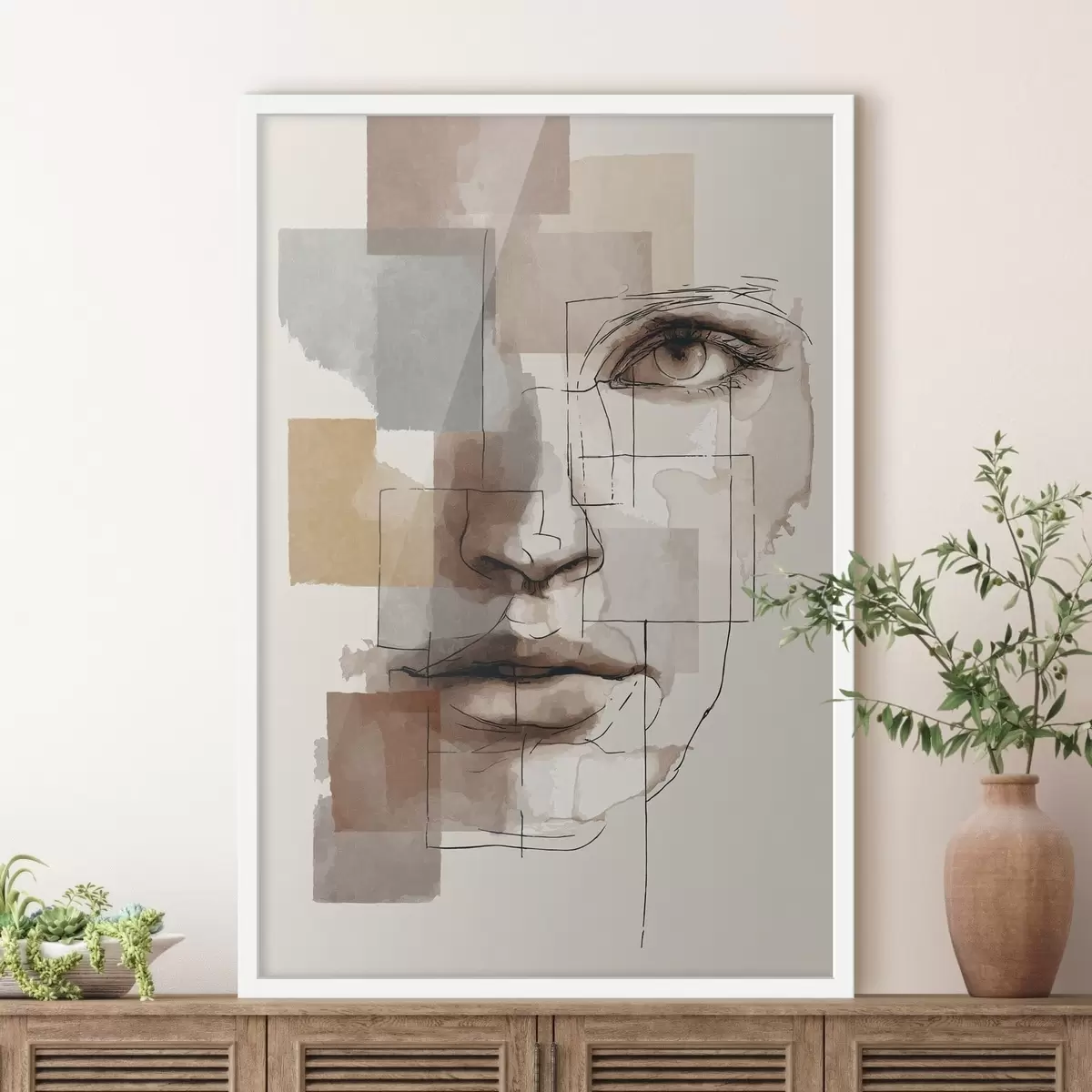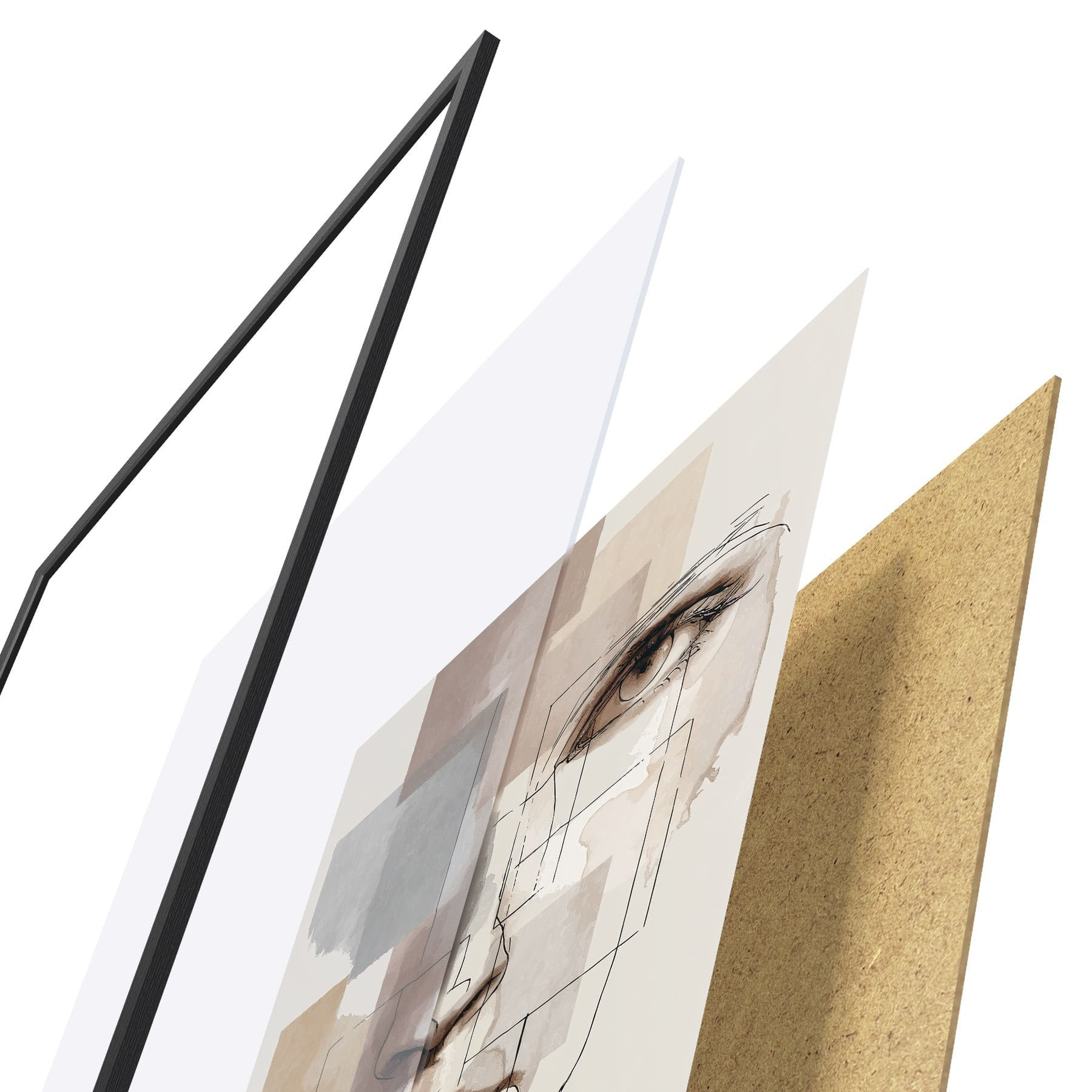 De poster bestaat uit een frame, plexiglas, geprinte afbeelding en spaanplaat achterkant. De poster kan meteen aan de muur worden gehangen dankzij de bevestigingen op de achterkant.