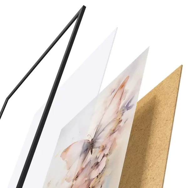 De poster bestaat uit een frame, plexiglas, geprinte afbeelding en spaanplaat achterkant. De poster kan meteen aan de muur worden gehangen dankzij de bevestigingen op de achterkant.