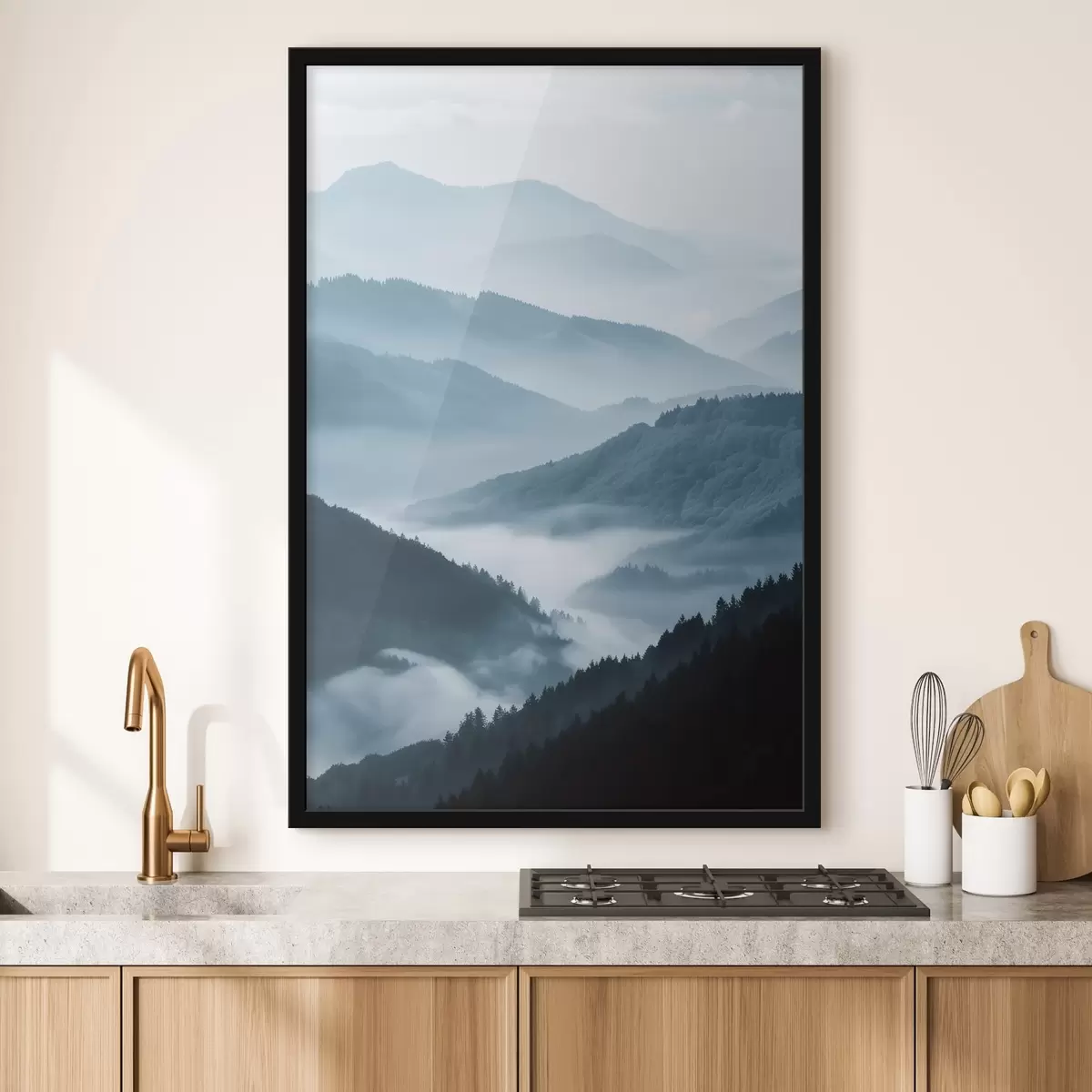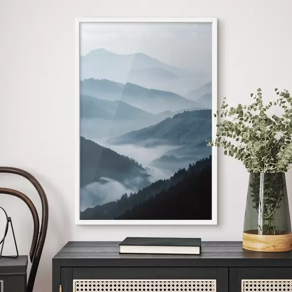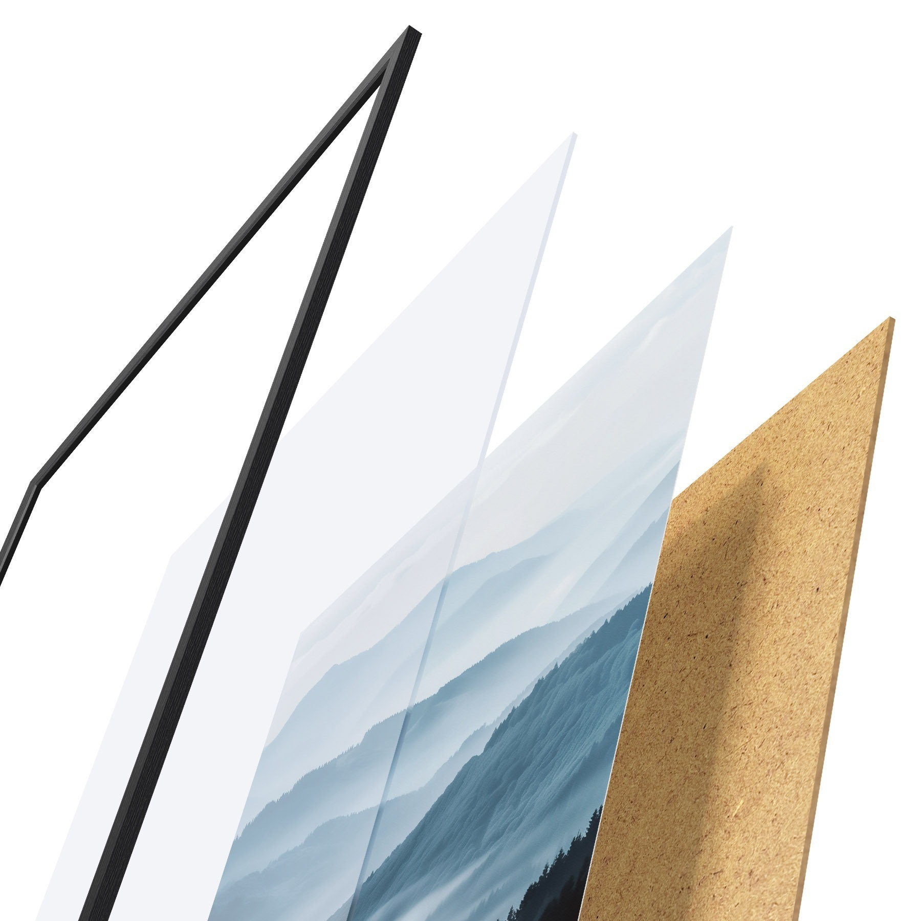 De poster bestaat uit een frame, plexiglas, geprinte afbeelding en spaanplaat achterkant. De poster kan meteen aan de muur worden gehangen dankzij de bevestigingen op de achterkant.