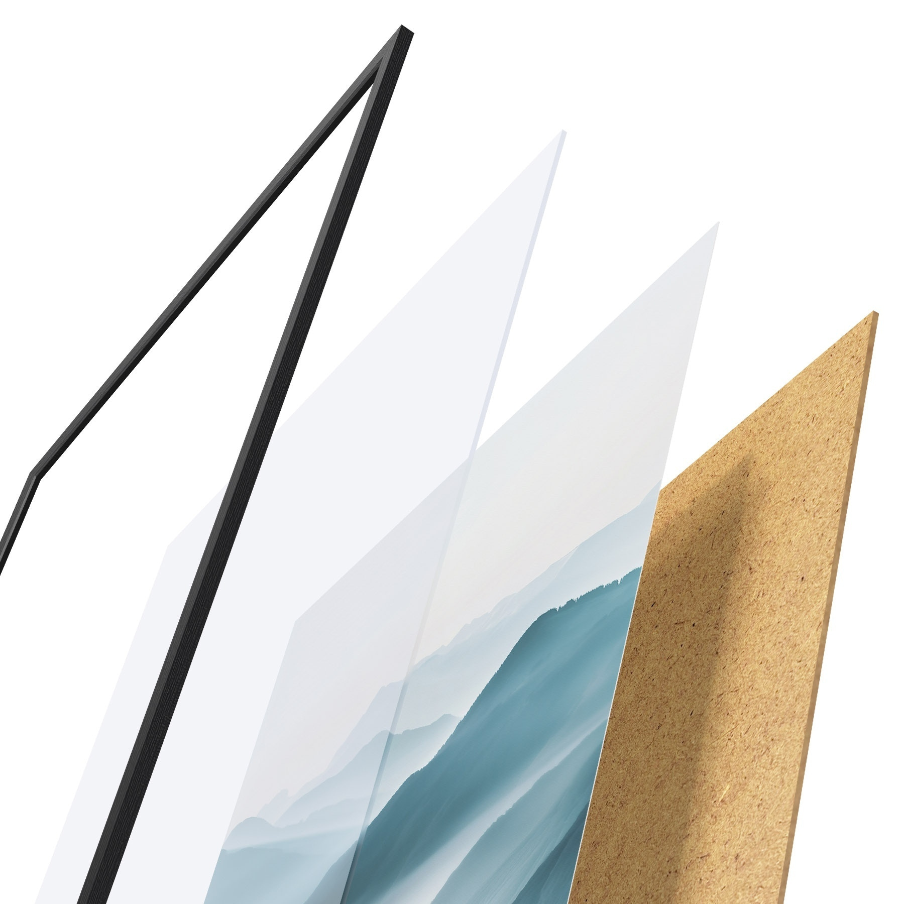 De poster bestaat uit een frame, plexiglas, geprinte afbeelding en spaanplaat achterkant. De poster kan meteen aan de muur worden gehangen dankzij de bevestigingen op de achterkant.