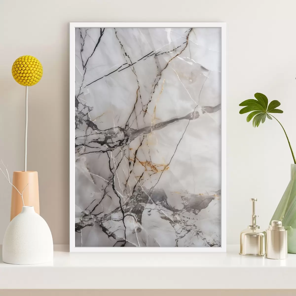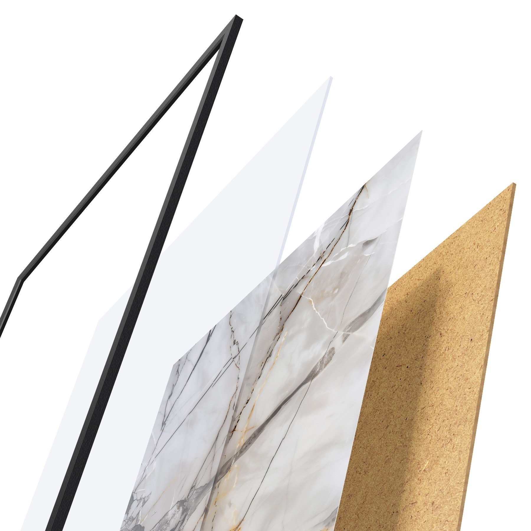 De poster bestaat uit een frame, plexiglas, geprinte afbeelding en spaanplaat achterkant. De poster kan meteen aan de muur worden gehangen dankzij de bevestigingen op de achterkant.