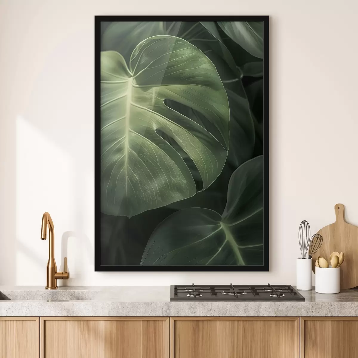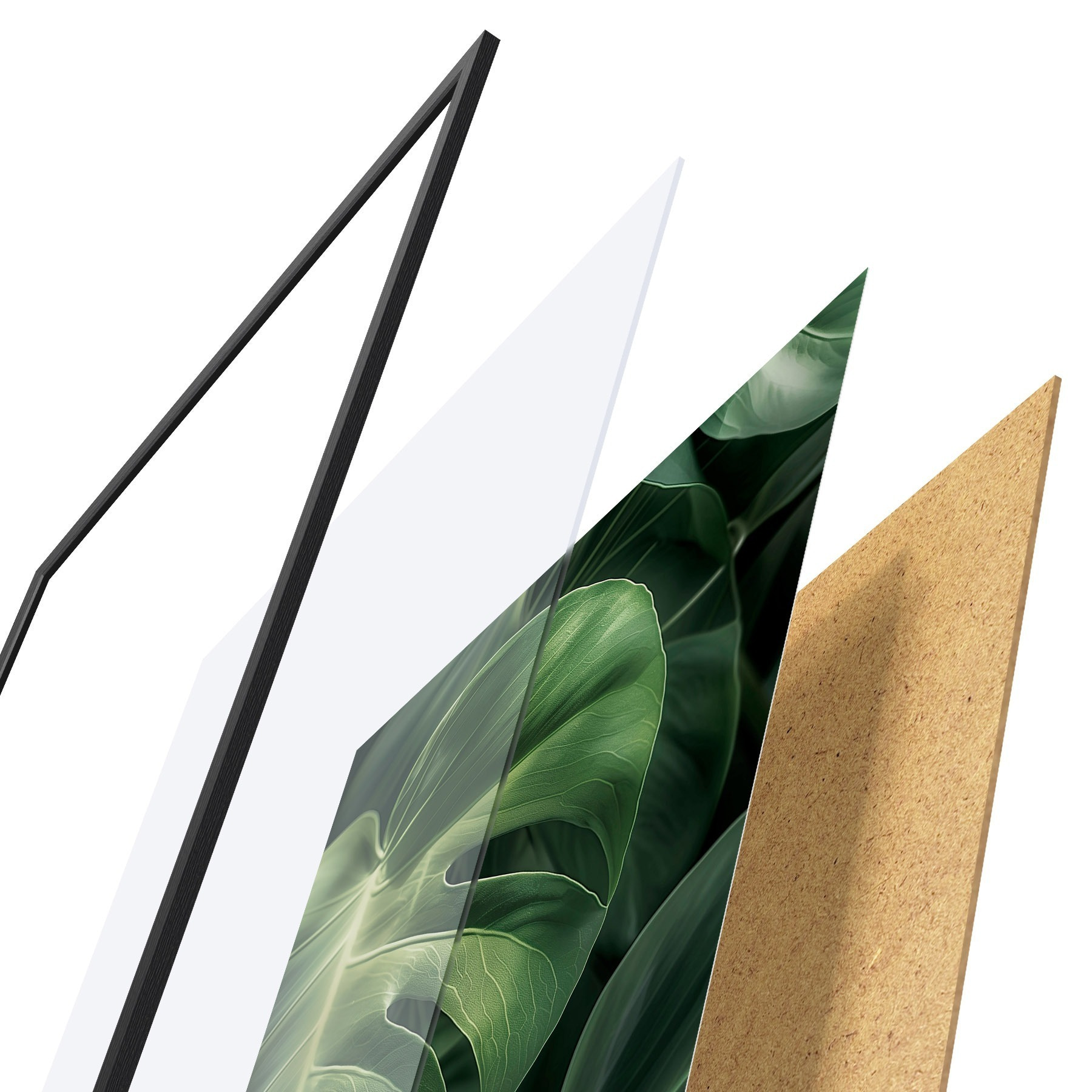 De poster bestaat uit een frame, plexiglas, geprinte afbeelding en spaanplaat achterkant. De poster kan meteen aan de muur worden gehangen dankzij de bevestigingen op de achterkant.
