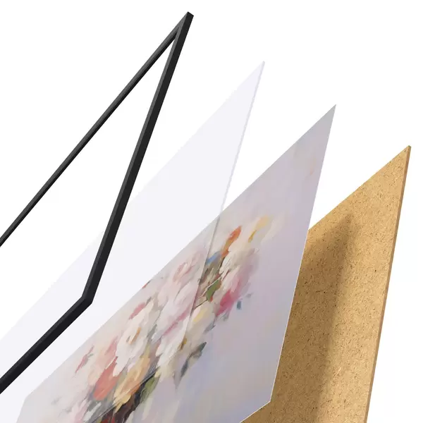 De poster bestaat uit een frame, plexiglas, geprinte afbeelding en spaanplaat achterkant. De poster kan meteen aan de muur worden gehangen dankzij de bevestigingen op de achterkant.