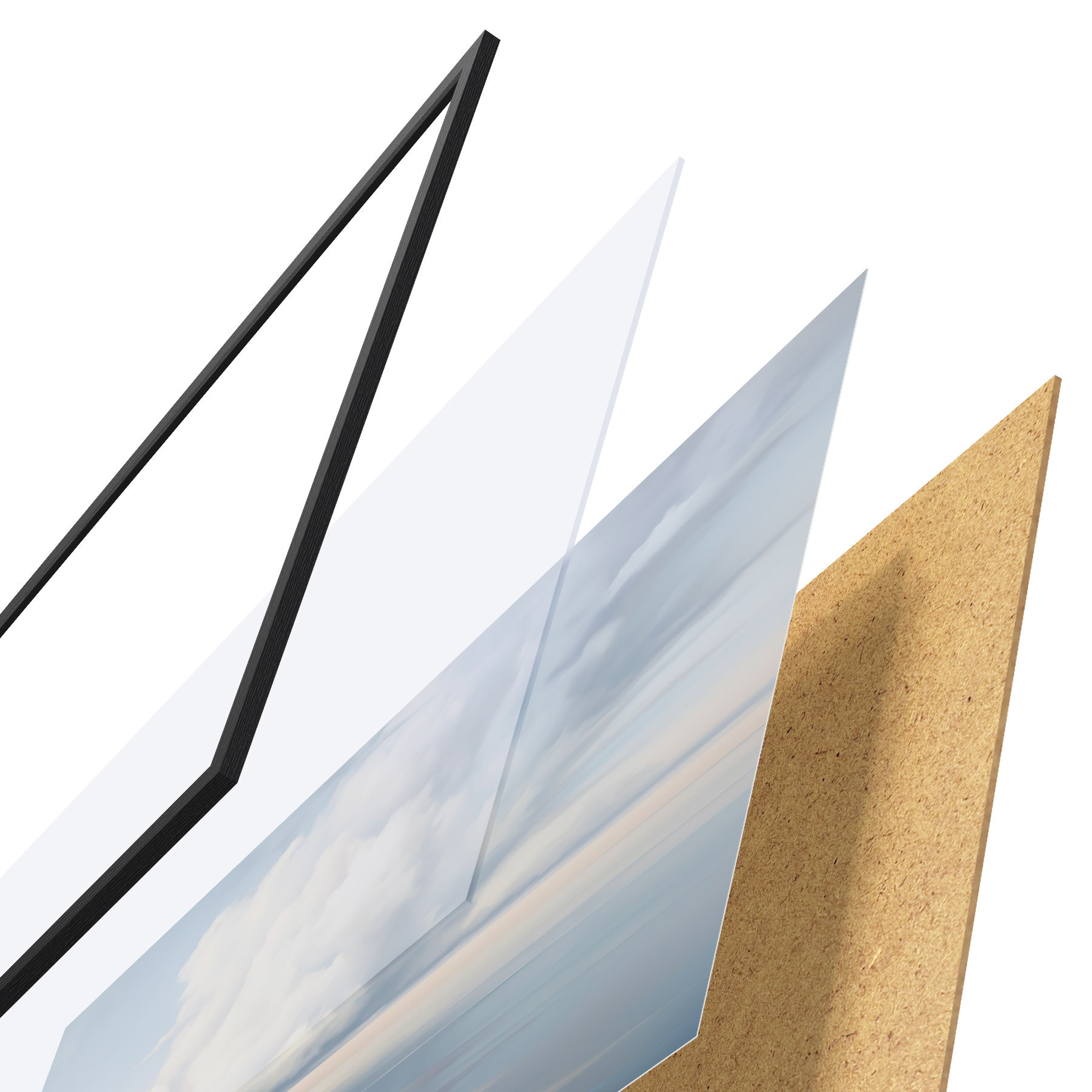 De poster bestaat uit een frame, plexiglas, geprinte afbeelding en spaanplaat achterkant. De poster kan meteen aan de muur worden gehangen dankzij de bevestigingen op de achterkant.