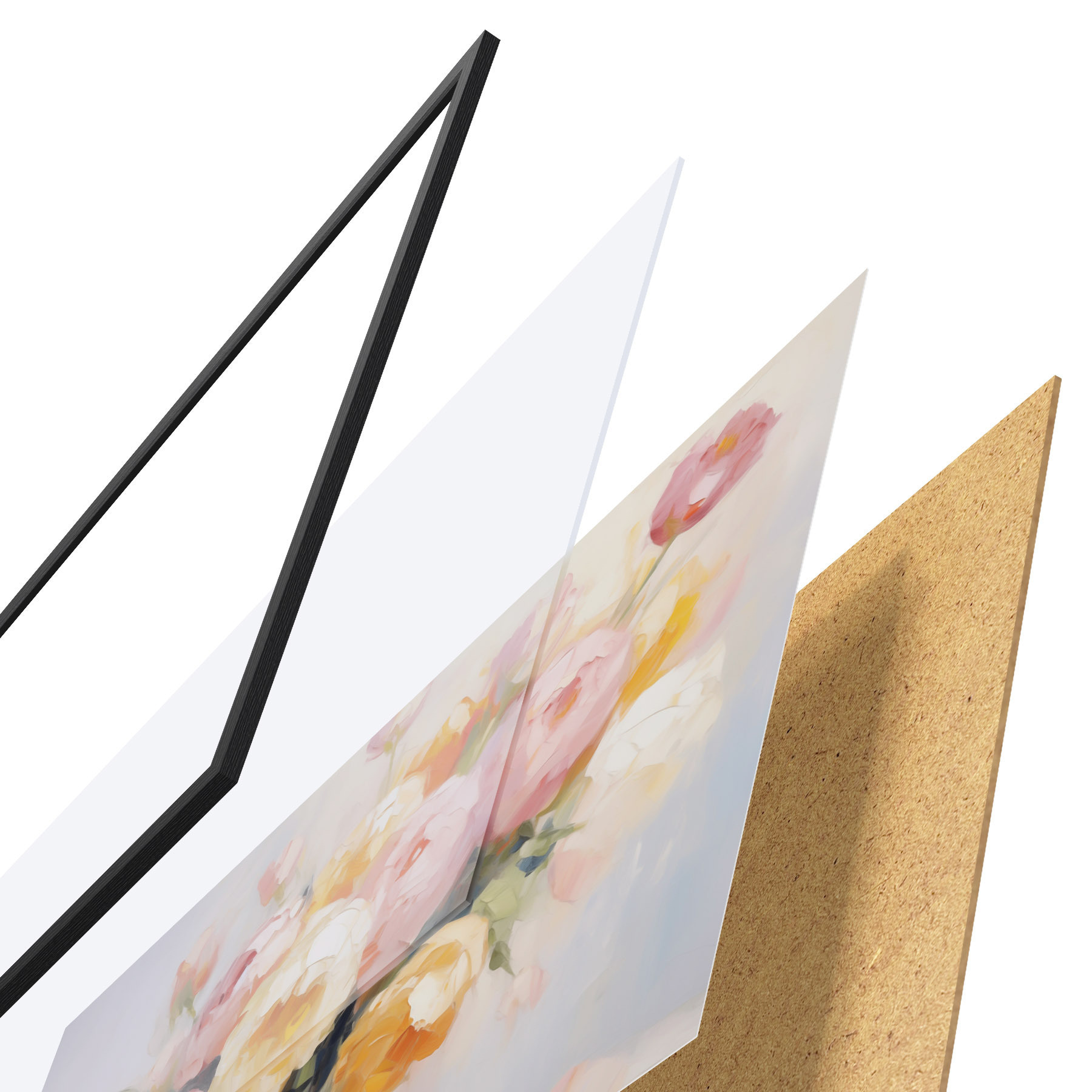 De poster bestaat uit een frame, plexiglas, geprinte afbeelding en spaanplaat achterkant. De poster kan meteen aan de muur worden gehangen dankzij de bevestigingen op de achterkant.