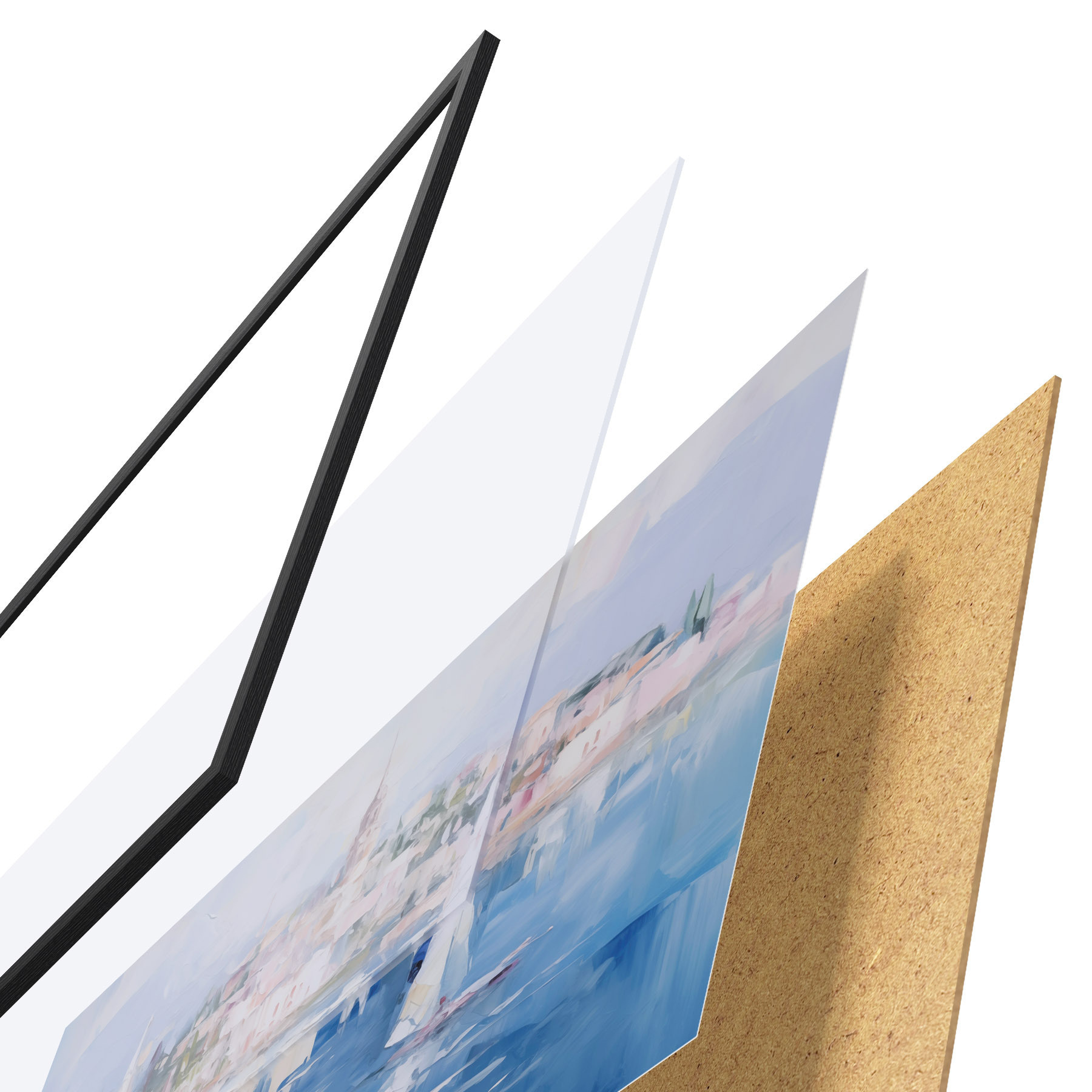 De poster bestaat uit een frame, plexiglas, geprinte afbeelding en spaanplaat achterkant. De poster kan meteen aan de muur worden gehangen dankzij de bevestigingen op de achterkant.