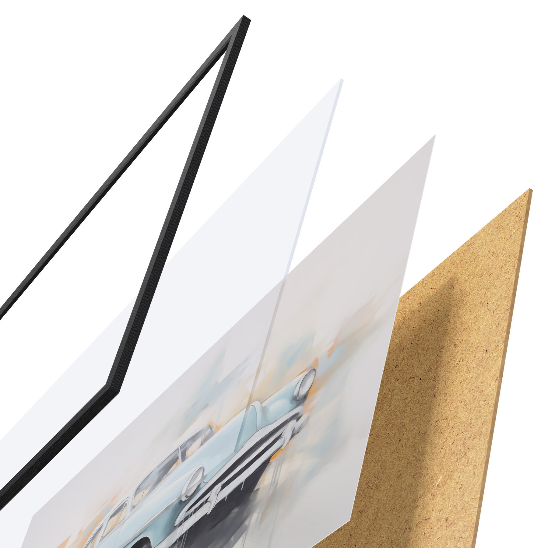 De poster bestaat uit een frame, plexiglas, geprinte afbeelding en spaanplaat achterkant. De poster kan meteen aan de muur worden gehangen dankzij de bevestigingen op de achterkant.