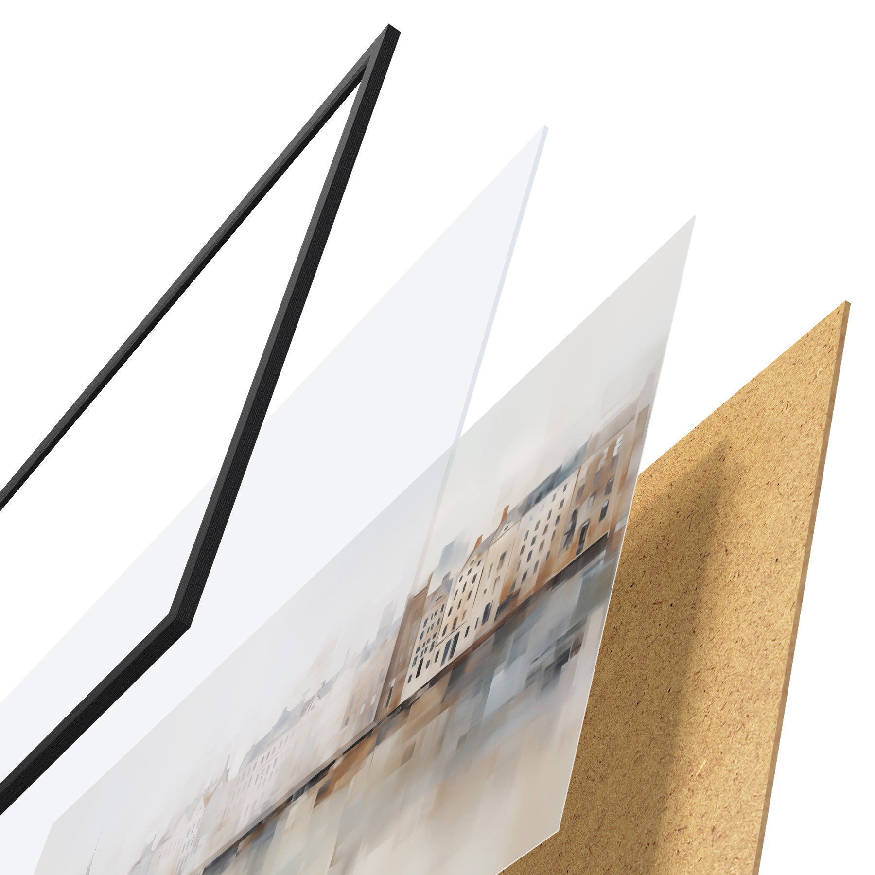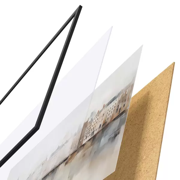 De poster bestaat uit een frame, plexiglas, geprinte afbeelding en spaanplaat achterkant. De poster kan meteen aan de muur worden gehangen dankzij de bevestigingen op de achterkant.