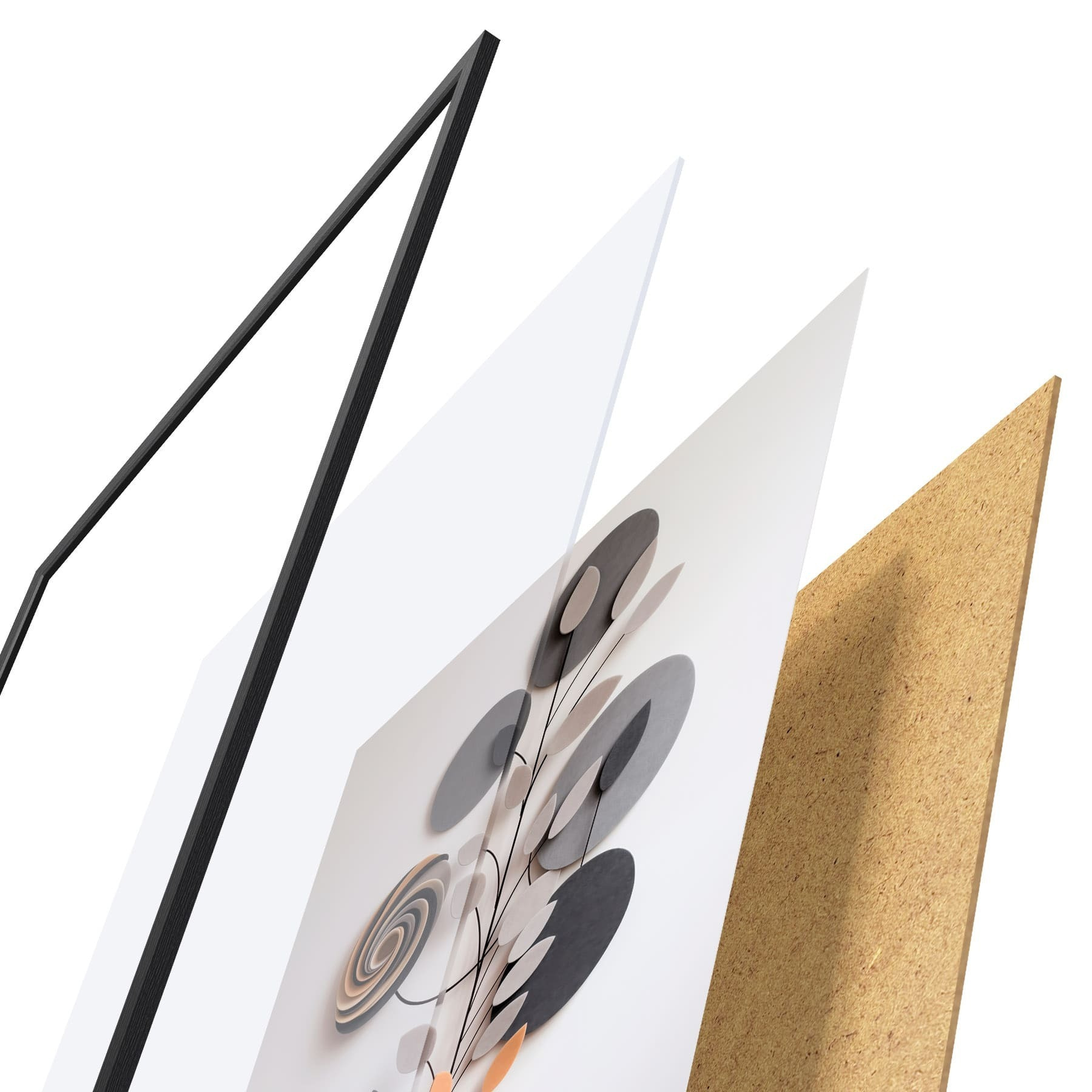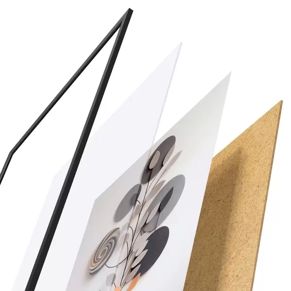 De poster bestaat uit een frame, plexiglas, geprinte afbeelding en spaanplaat achterkant. De poster kan meteen aan de muur worden gehangen dankzij de bevestigingen op de achterkant.