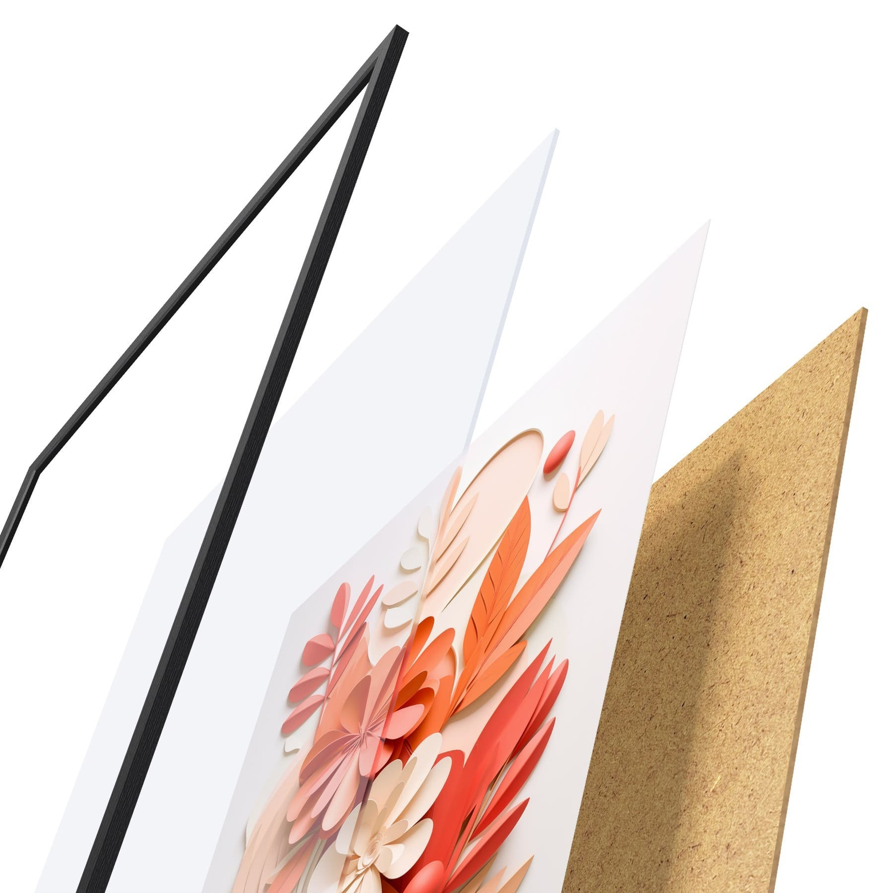De poster bestaat uit een frame, plexiglas, geprinte afbeelding en spaanplaat achterkant. De poster kan meteen aan de muur worden gehangen dankzij de bevestigingen op de achterkant.