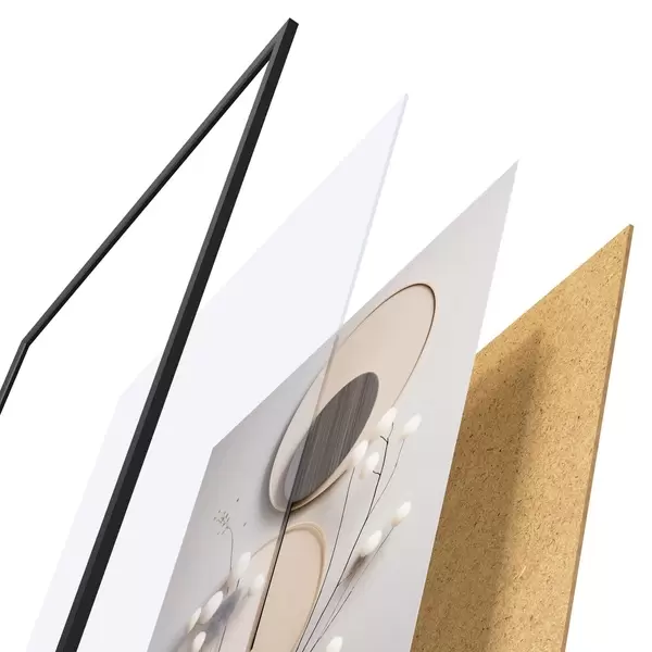 De poster bestaat uit een frame, plexiglas, geprinte afbeelding en spaanplaat achterkant. De poster kan meteen aan de muur worden gehangen dankzij de bevestigingen op de achterkant.