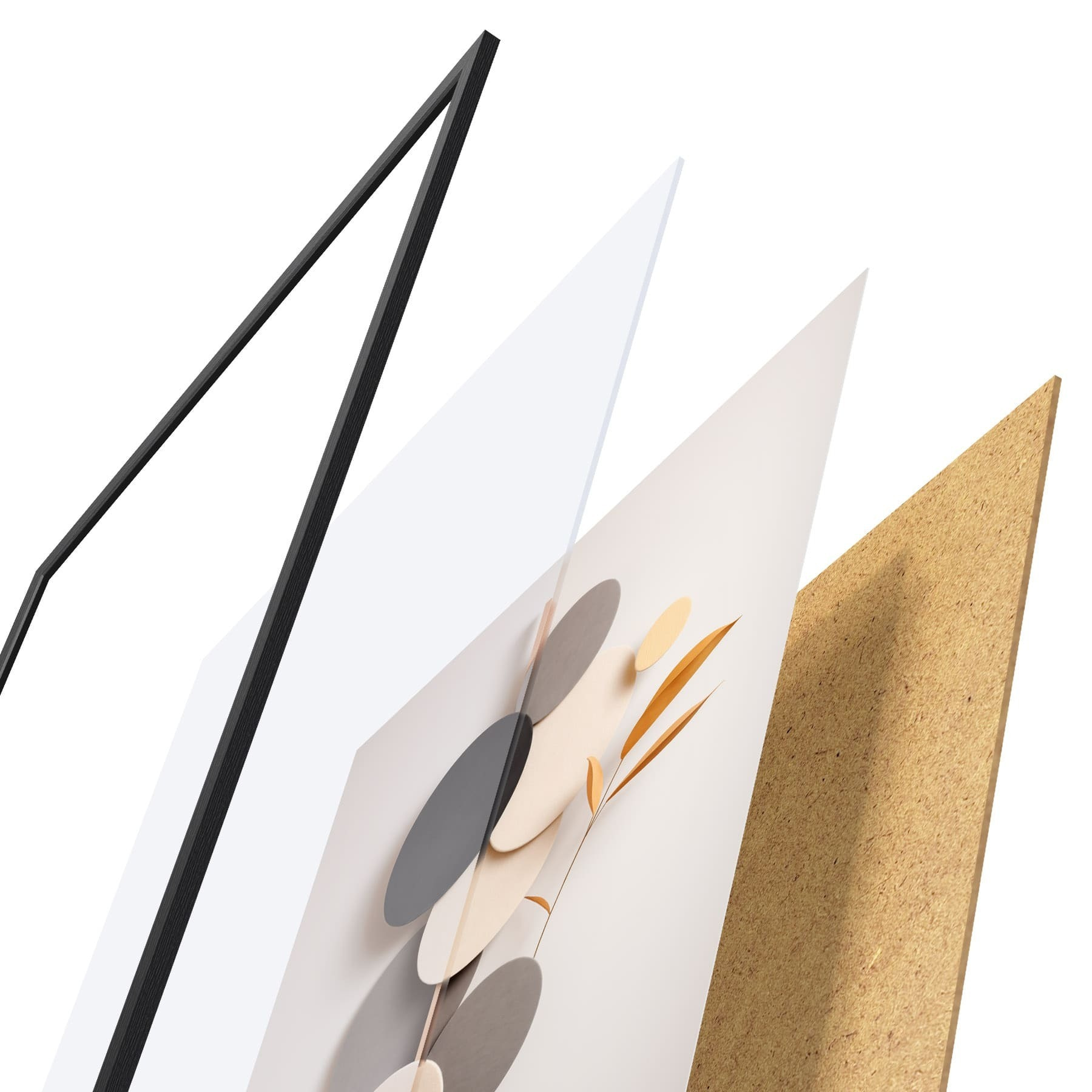 De poster bestaat uit een frame, plexiglas, geprinte afbeelding en spaanplaat achterkant. De poster kan meteen aan de muur worden gehangen dankzij de bevestigingen op de achterkant.