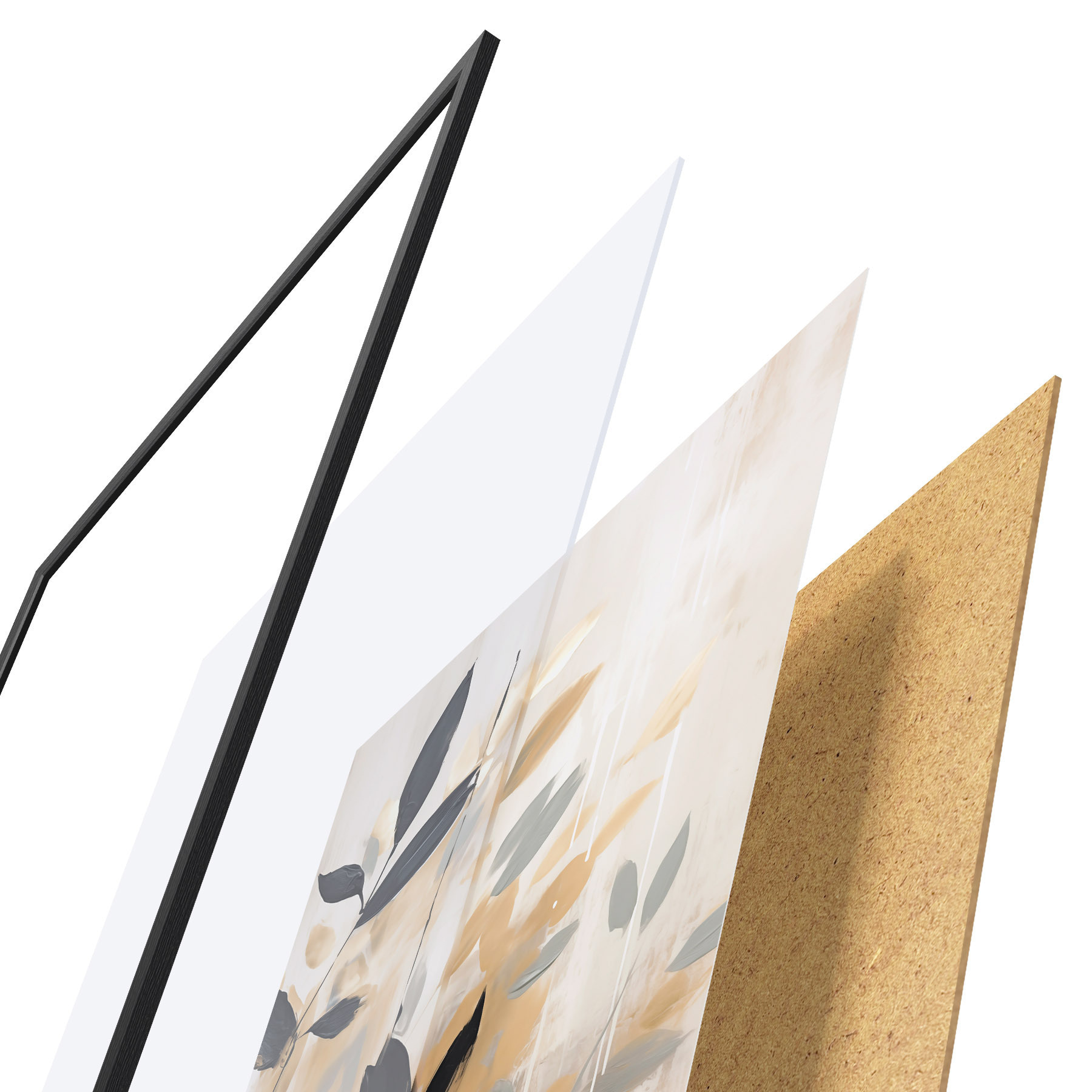 De poster bestaat uit een frame, plexiglas, geprinte afbeelding en spaanplaat achterkant. De poster kan meteen aan de muur worden gehangen dankzij de bevestigingen op de achterkant.