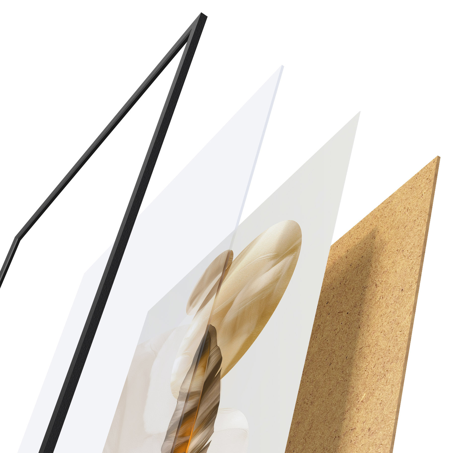 De poster bestaat uit een frame, plexiglas, geprinte afbeelding en spaanplaat achterkant. De poster kan meteen aan de muur worden gehangen dankzij de bevestigingen op de achterkant.