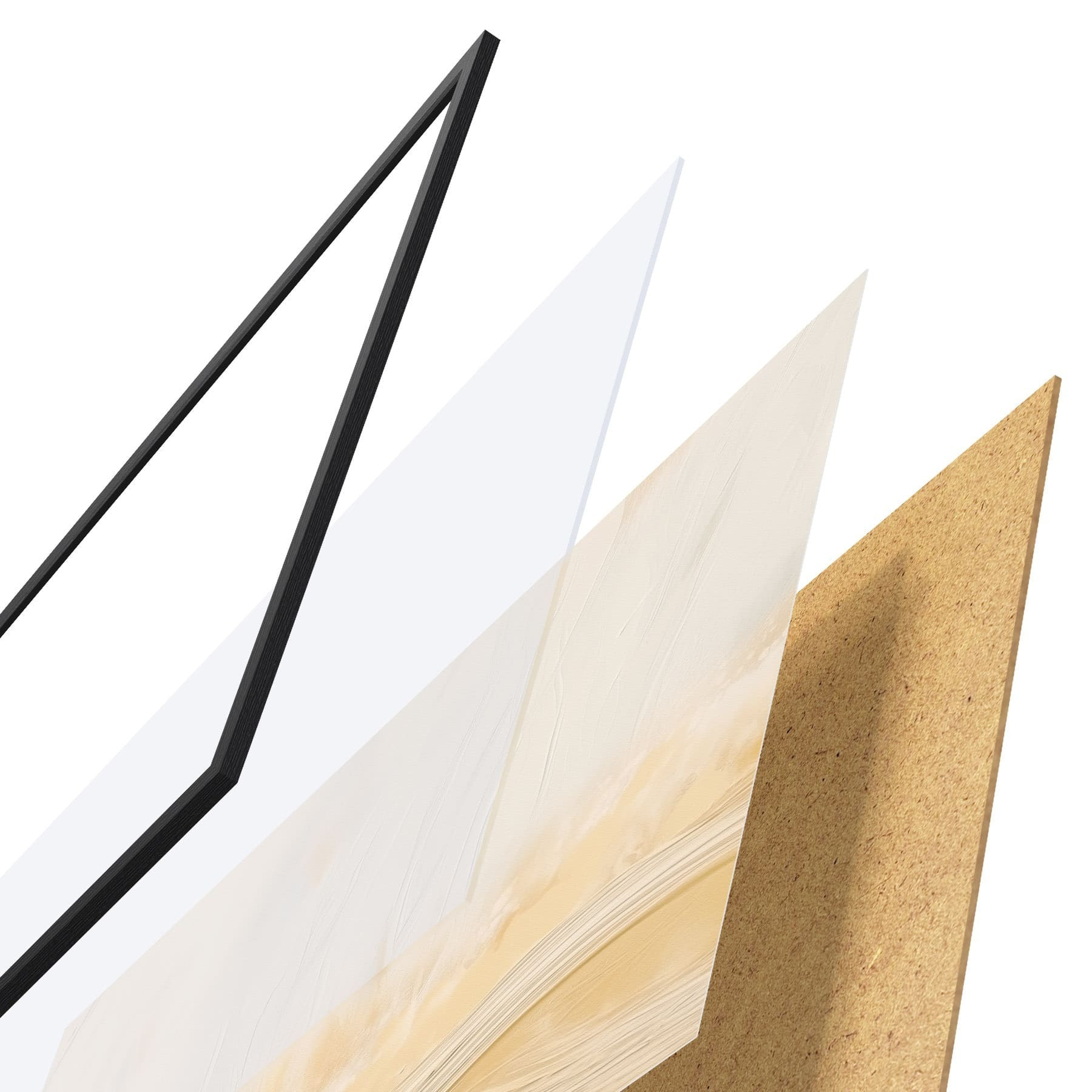 De poster bestaat uit een frame, plexiglas, geprinte afbeelding en spaanplaat achterkant. De poster kan meteen aan de muur worden gehangen dankzij de bevestigingen op de achterkant.