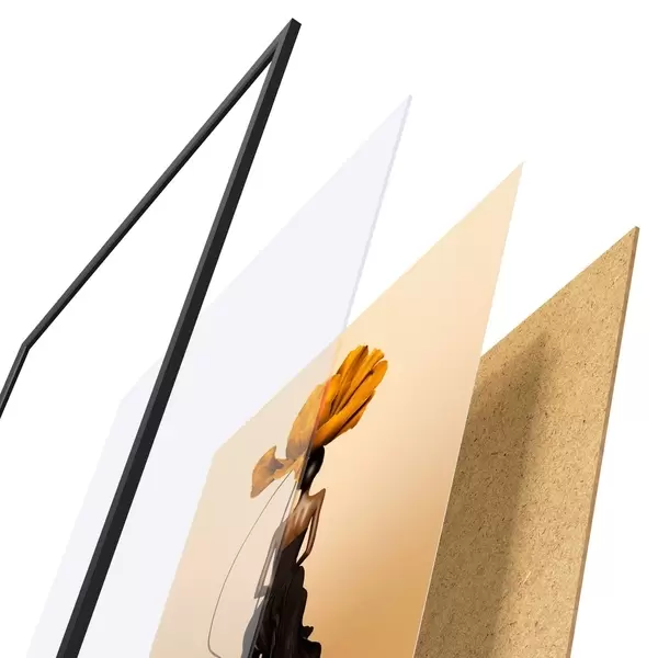 De poster bestaat uit een frame, plexiglas, geprinte afbeelding en spaanplaat achterkant. De poster kan meteen aan de muur worden gehangen dankzij de bevestigingen op de achterkant.