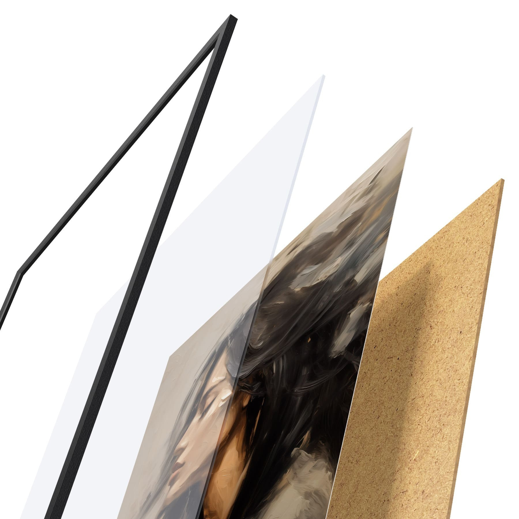 De poster bestaat uit een frame, plexiglas, geprinte afbeelding en spaanplaat achterkant. De poster kan meteen aan de muur worden gehangen dankzij de bevestigingen op de achterkant.
