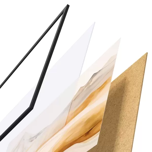 De poster bestaat uit een frame, plexiglas, geprinte afbeelding en spaanplaat achterkant. De poster kan meteen aan de muur worden gehangen dankzij de bevestigingen op de achterkant.