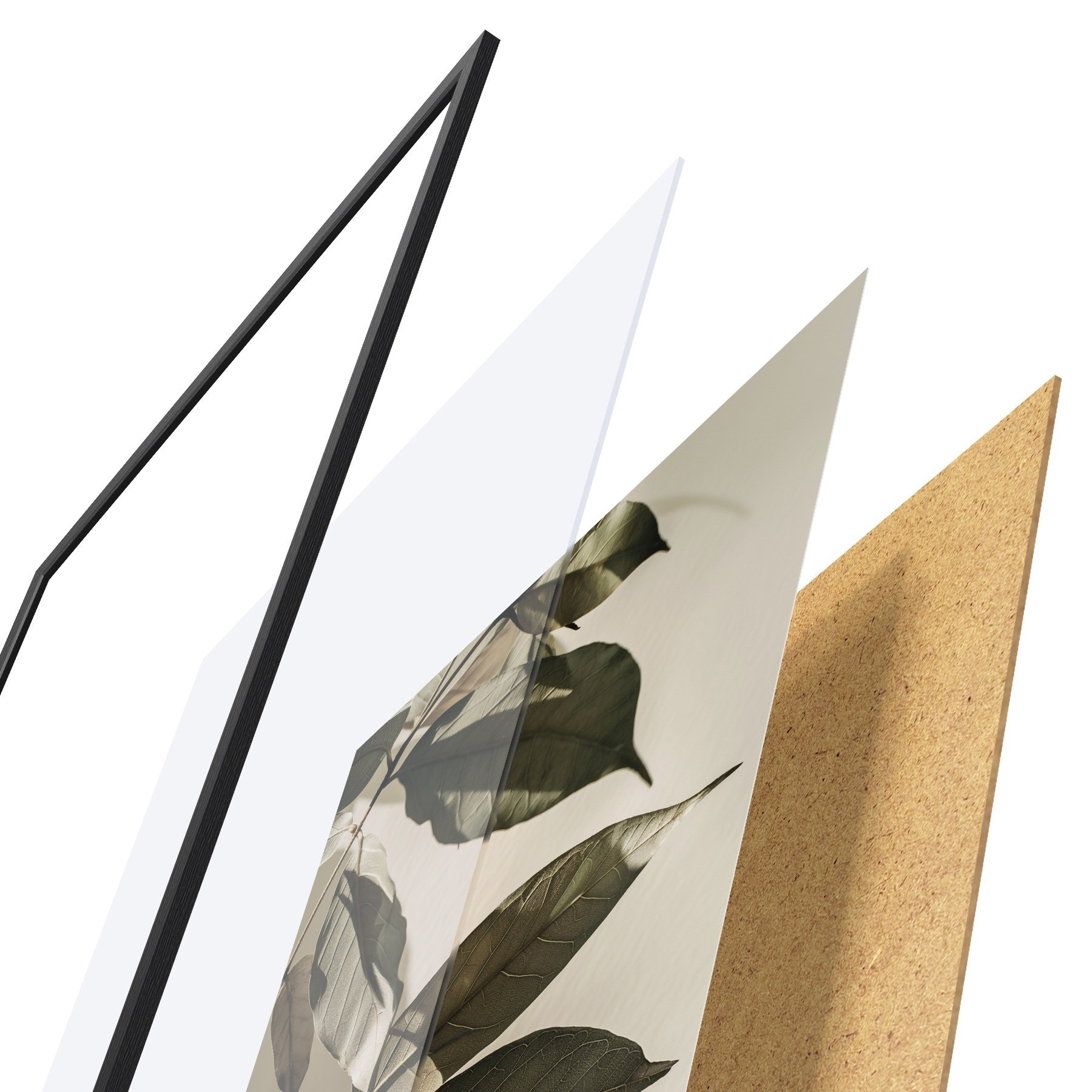 De poster bestaat uit een frame, plexiglas, geprinte afbeelding en spaanplaat achterkant. De poster kan meteen aan de muur worden gehangen dankzij de bevestigingen op de achterkant.