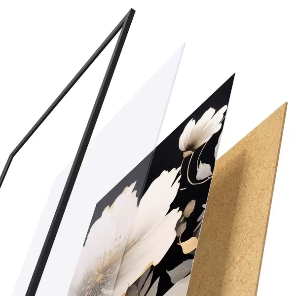 De poster bestaat uit een frame, plexiglas, geprinte afbeelding en spaanplaat achterkant. De poster kan meteen aan de muur worden gehangen dankzij de bevestigingen op de achterkant.