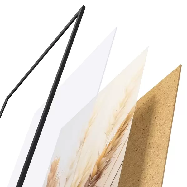 De poster bestaat uit een frame, plexiglas, geprinte afbeelding en spaanplaat achterkant. De poster kan meteen aan de muur worden gehangen dankzij de bevestigingen op de achterkant.