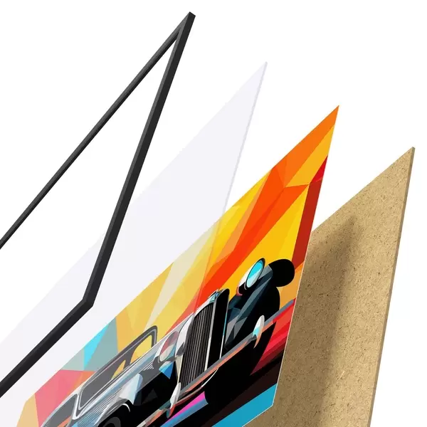 De poster bestaat uit een frame, plexiglas, geprinte afbeelding en spaanplaat achterkant. De poster kan meteen aan de muur worden gehangen dankzij de bevestigingen op de achterkant.