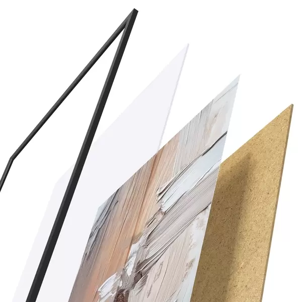 De poster bestaat uit een frame, plexiglas, geprinte afbeelding en spaanplaat achterkant. De poster kan meteen aan de muur worden gehangen dankzij de bevestigingen op de achterkant.