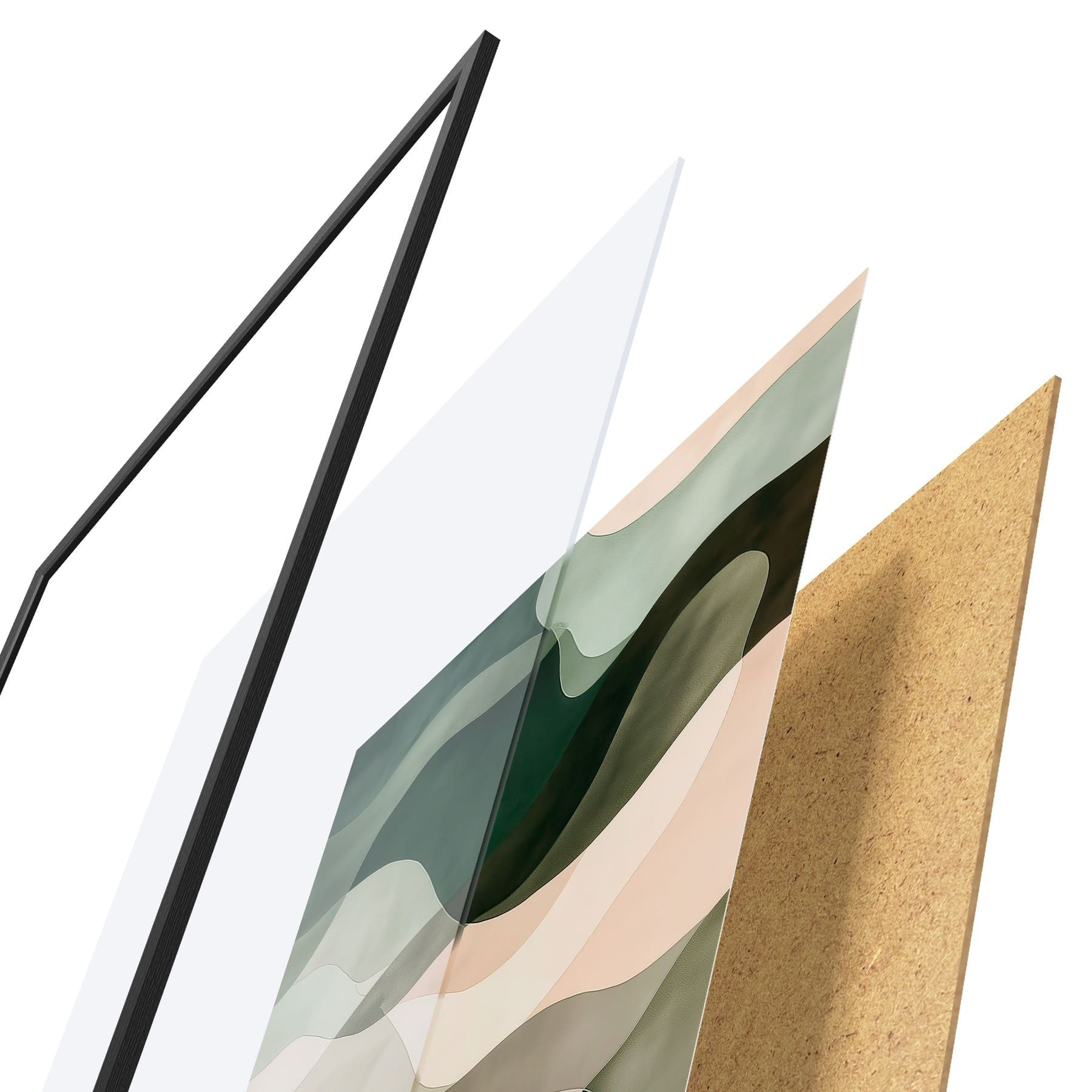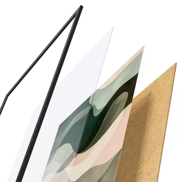 De poster bestaat uit een frame, plexiglas, geprinte afbeelding en spaanplaat achterkant. De poster kan meteen aan de muur worden gehangen dankzij de bevestigingen op de achterkant.