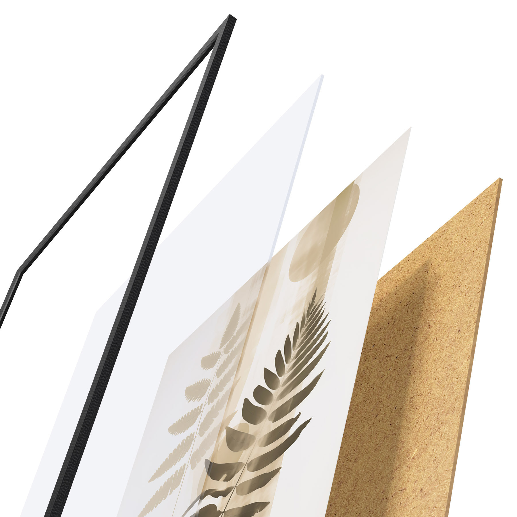 De poster bestaat uit een frame, plexiglas, geprinte afbeelding en spaanplaat achterkant. De poster kan meteen aan de muur worden gehangen dankzij de bevestigingen op de achterkant.