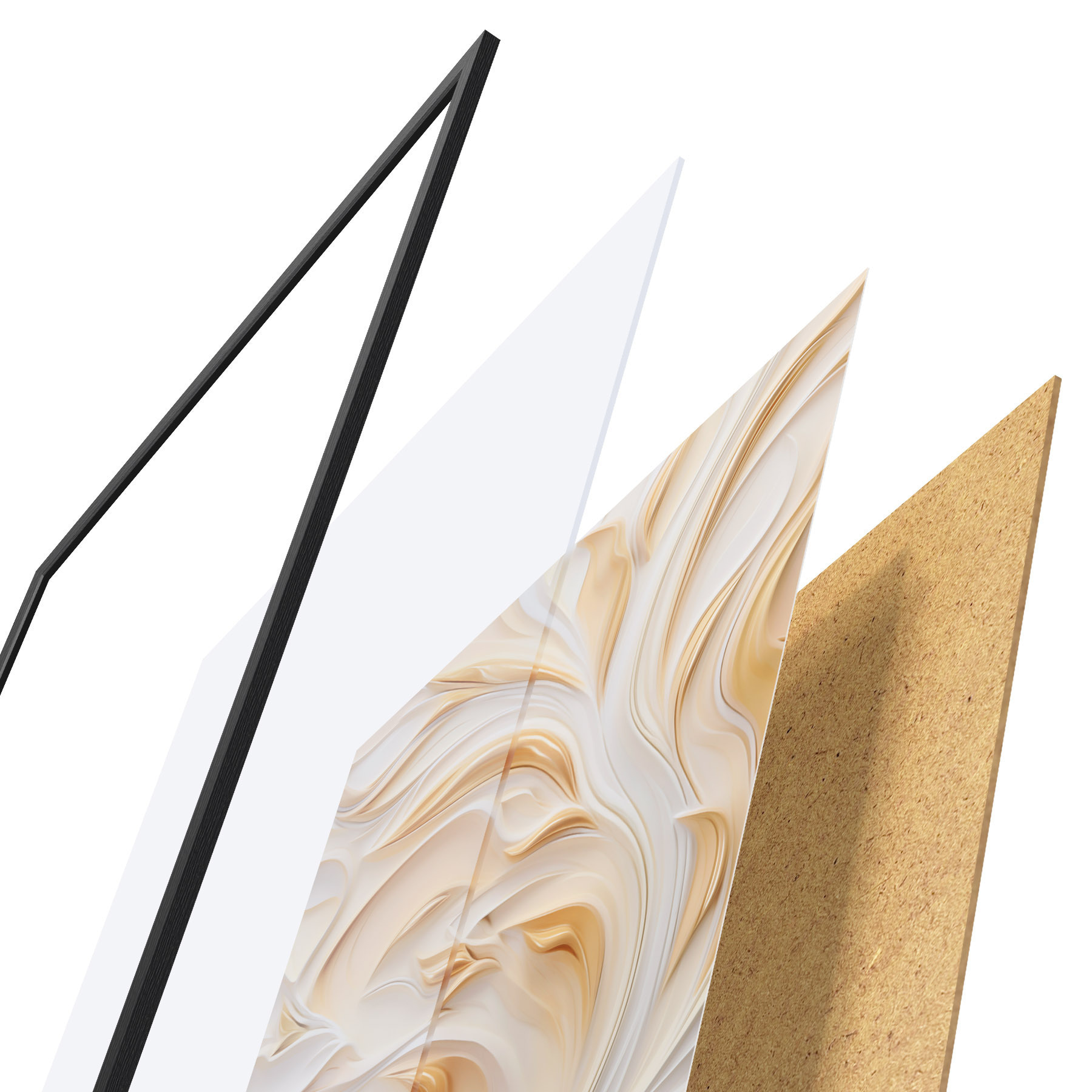 De poster bestaat uit een frame, plexiglas, geprinte afbeelding en spaanplaat achterkant. De poster kan meteen aan de muur worden gehangen dankzij de bevestigingen op de achterkant.