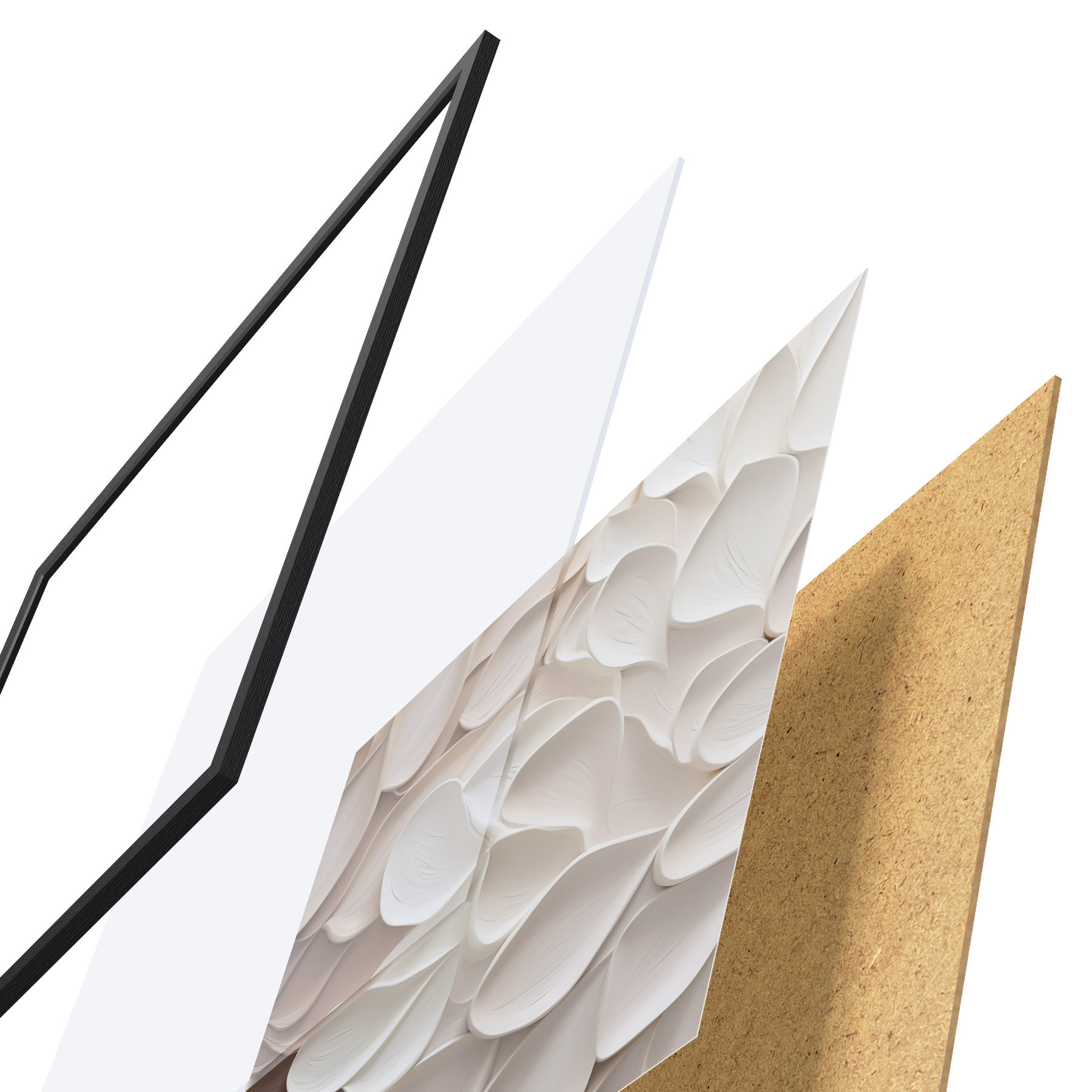 De poster bestaat uit een frame, plexiglas, geprinte afbeelding en spaanplaat achterkant. De poster kan meteen aan de muur worden gehangen dankzij de bevestigingen op de achterkant.