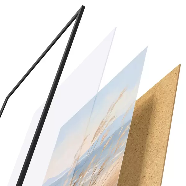 De poster bestaat uit een frame, plexiglas, geprinte afbeelding en spaanplaat achterkant. De poster kan meteen aan de muur worden gehangen dankzij de bevestigingen op de achterkant.