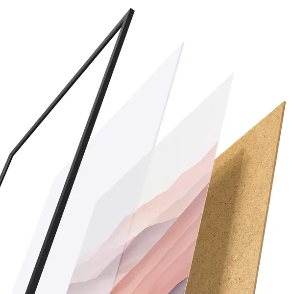 De poster bestaat uit een frame, plexiglas, geprinte afbeelding en spaanplaat achterkant. De poster kan meteen aan de muur worden gehangen dankzij de bevestigingen op de achterkant.
