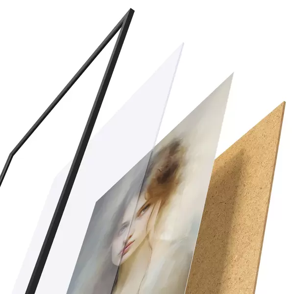 De poster bestaat uit een frame, plexiglas, geprinte afbeelding en spaanplaat achterkant. De poster kan meteen aan de muur worden gehangen dankzij de bevestigingen op de achterkant.