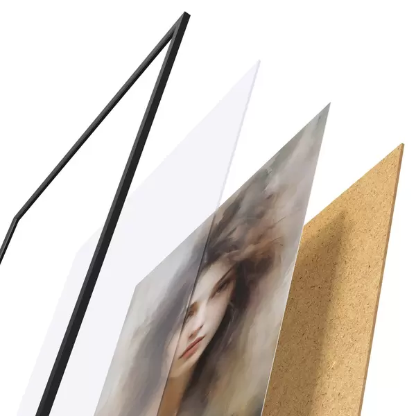 De poster bestaat uit een frame, plexiglas, geprinte afbeelding en spaanplaat achterkant. De poster kan meteen aan de muur worden gehangen dankzij de bevestigingen op de achterkant.