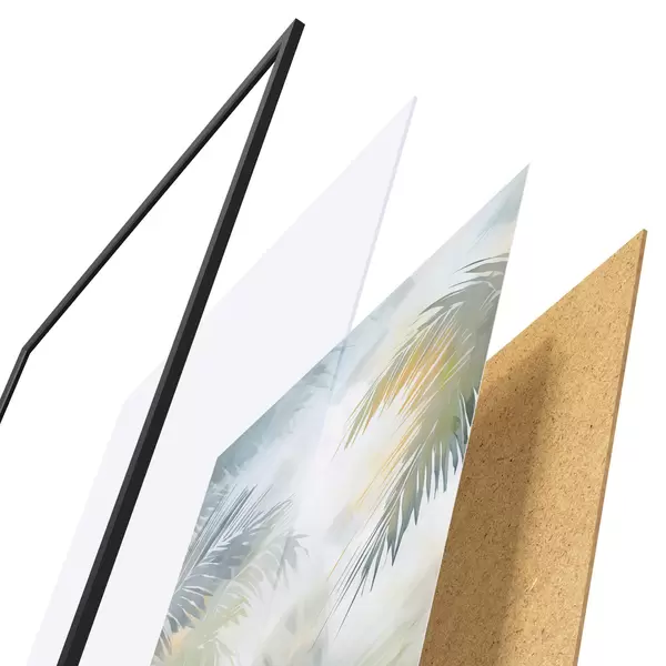 De poster bestaat uit een frame, plexiglas, geprinte afbeelding en spaanplaat achterkant. De poster kan meteen aan de muur worden gehangen dankzij de bevestigingen op de achterkant.