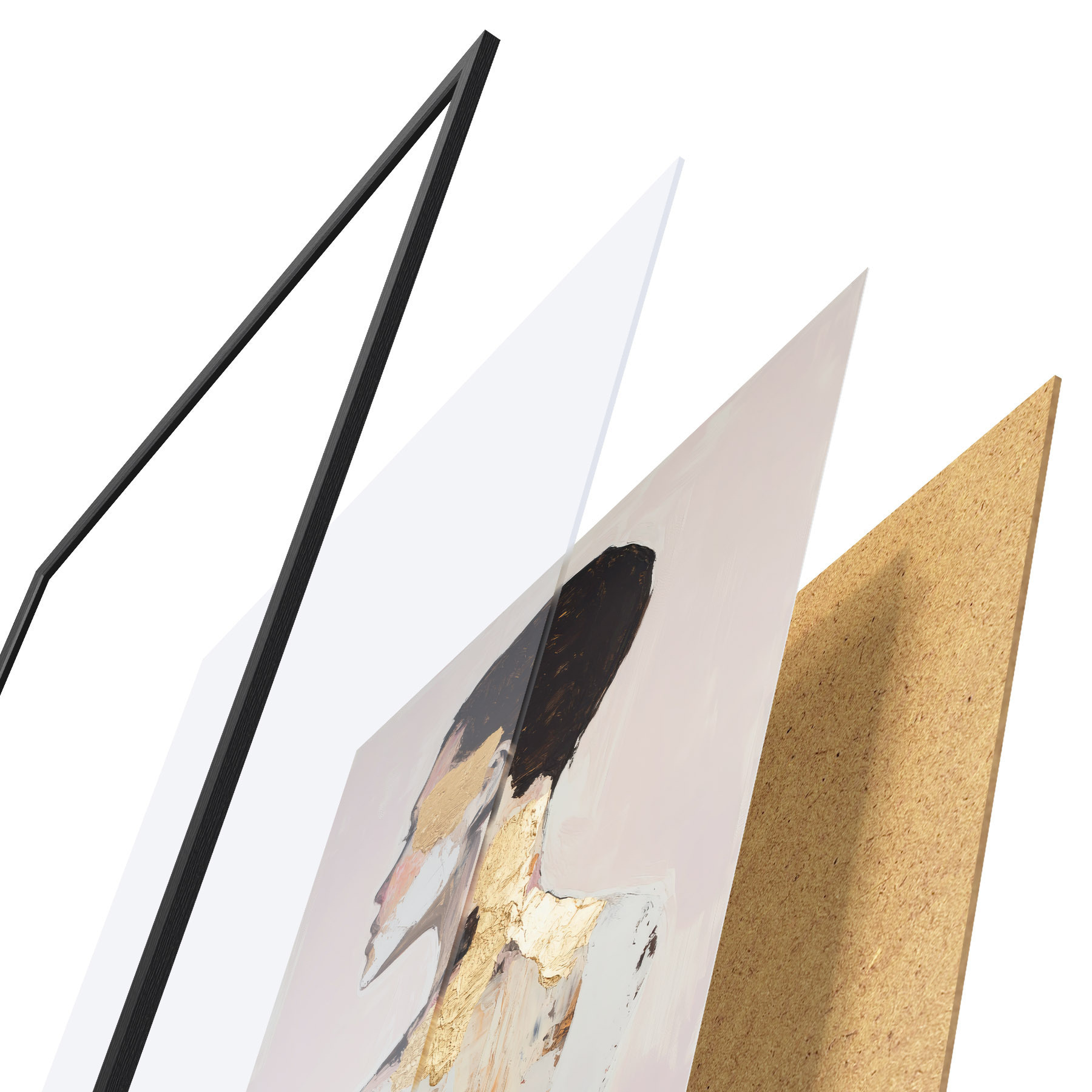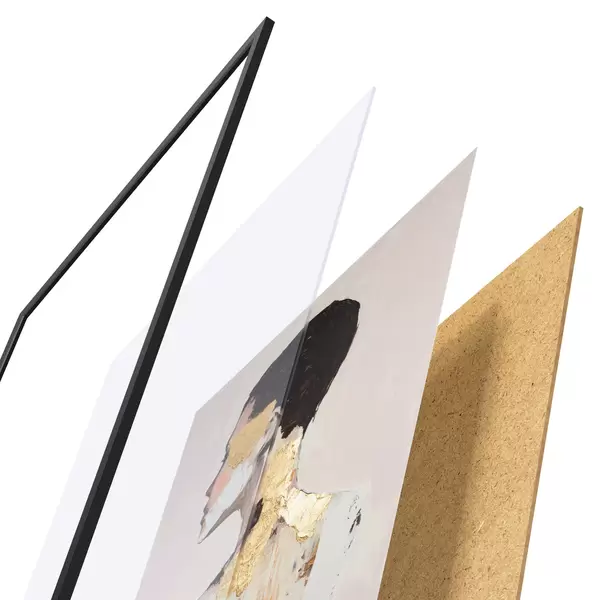 De poster bestaat uit een frame, plexiglas, geprinte afbeelding en spaanplaat achterkant. De poster kan meteen aan de muur worden gehangen dankzij de bevestigingen op de achterkant.