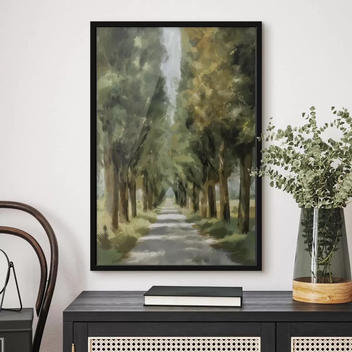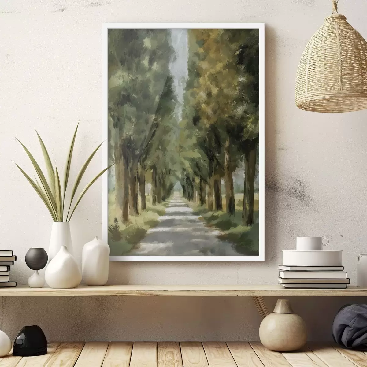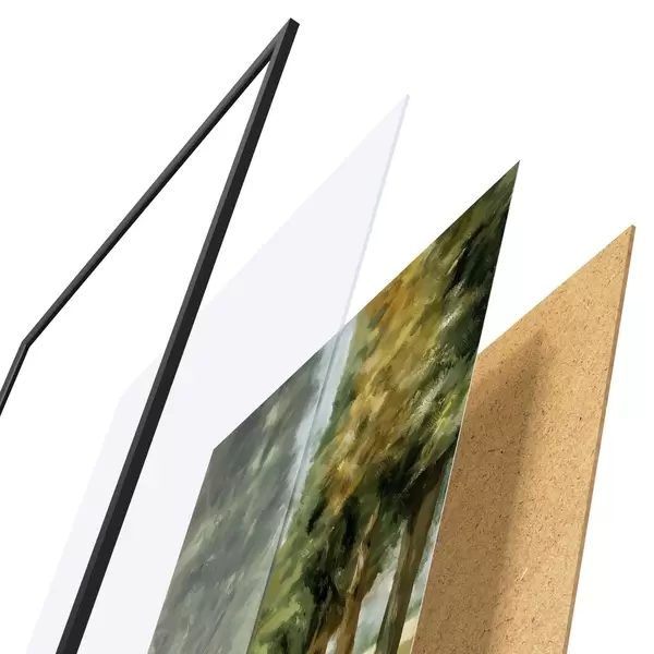 De poster bestaat uit een frame, plexiglas, geprinte afbeelding en spaanplaat achterkant. De poster kan meteen aan de muur worden gehangen dankzij de bevestigingen op de achterkant.