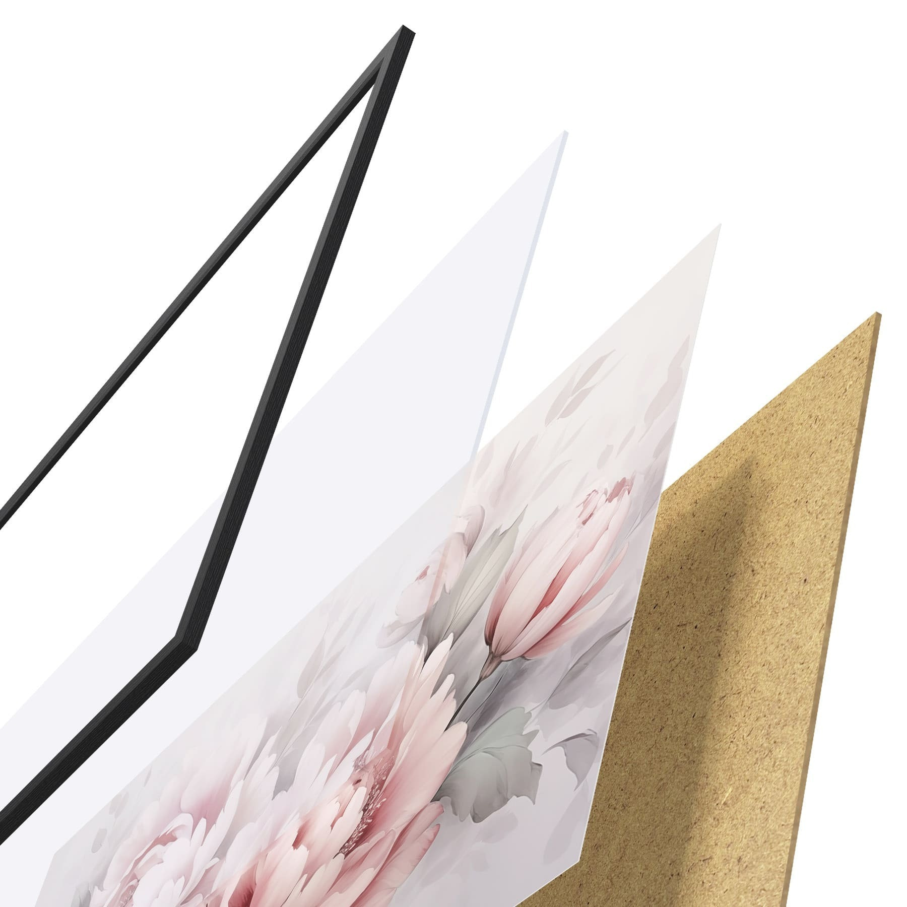 De poster bestaat uit een frame, plexiglas, geprinte afbeelding en spaanplaat achterkant. De poster kan meteen aan de muur worden gehangen dankzij de bevestigingen op de achterkant.