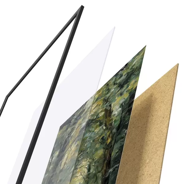 De poster bestaat uit een frame, plexiglas, geprinte afbeelding en spaanplaat achterkant. De poster kan meteen aan de muur worden gehangen dankzij de bevestigingen op de achterkant.
