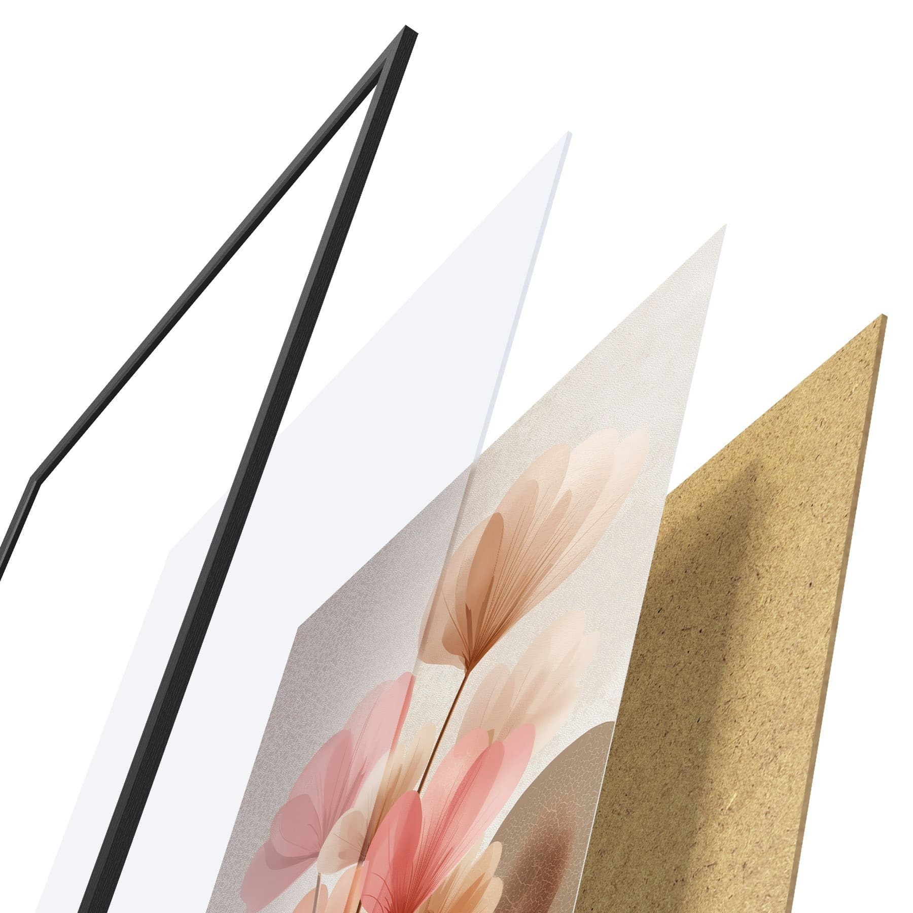 De poster bestaat uit een frame, plexiglas, geprinte afbeelding en spaanplaat achterkant. De poster kan meteen aan de muur worden gehangen dankzij de bevestigingen op de achterkant.