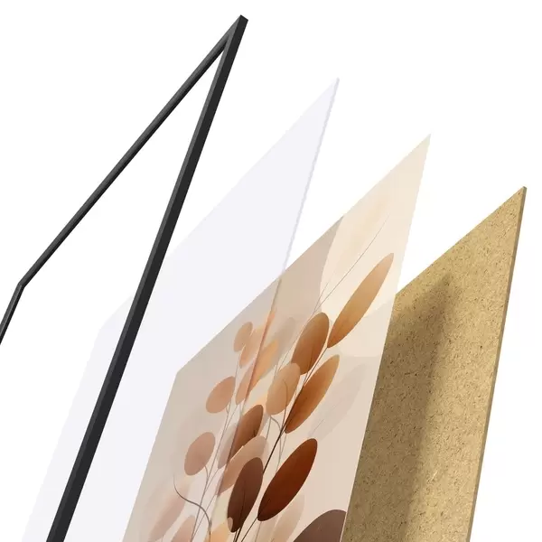 De poster bestaat uit een frame, plexiglas, geprinte afbeelding en spaanplaat achterkant. De poster kan meteen aan de muur worden gehangen dankzij de bevestigingen op de achterkant.