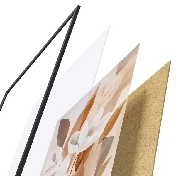 De poster bestaat uit een frame, plexiglas, geprinte afbeelding en spaanplaat achterkant. De poster kan meteen aan de muur worden gehangen dankzij de bevestigingen op de achterkant.