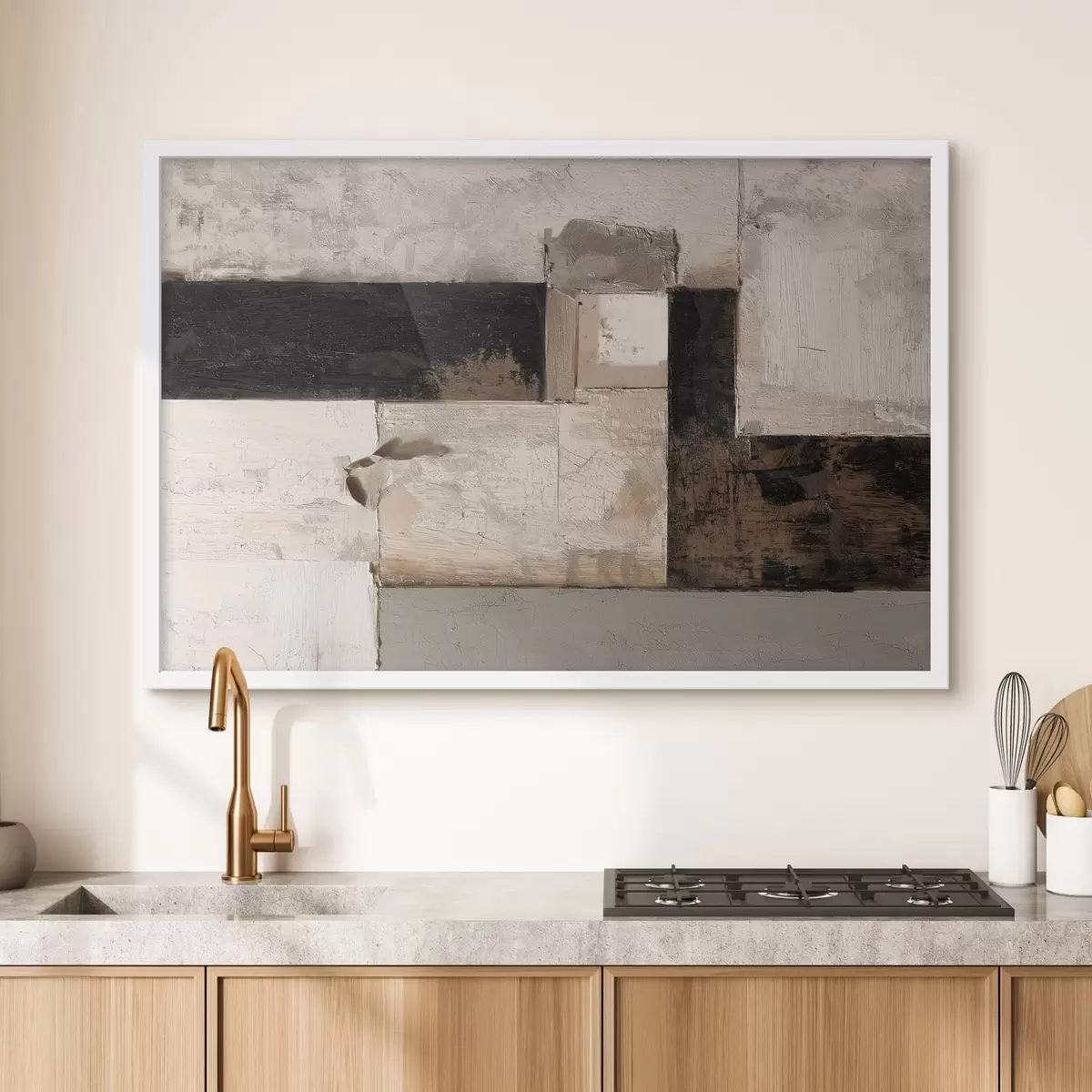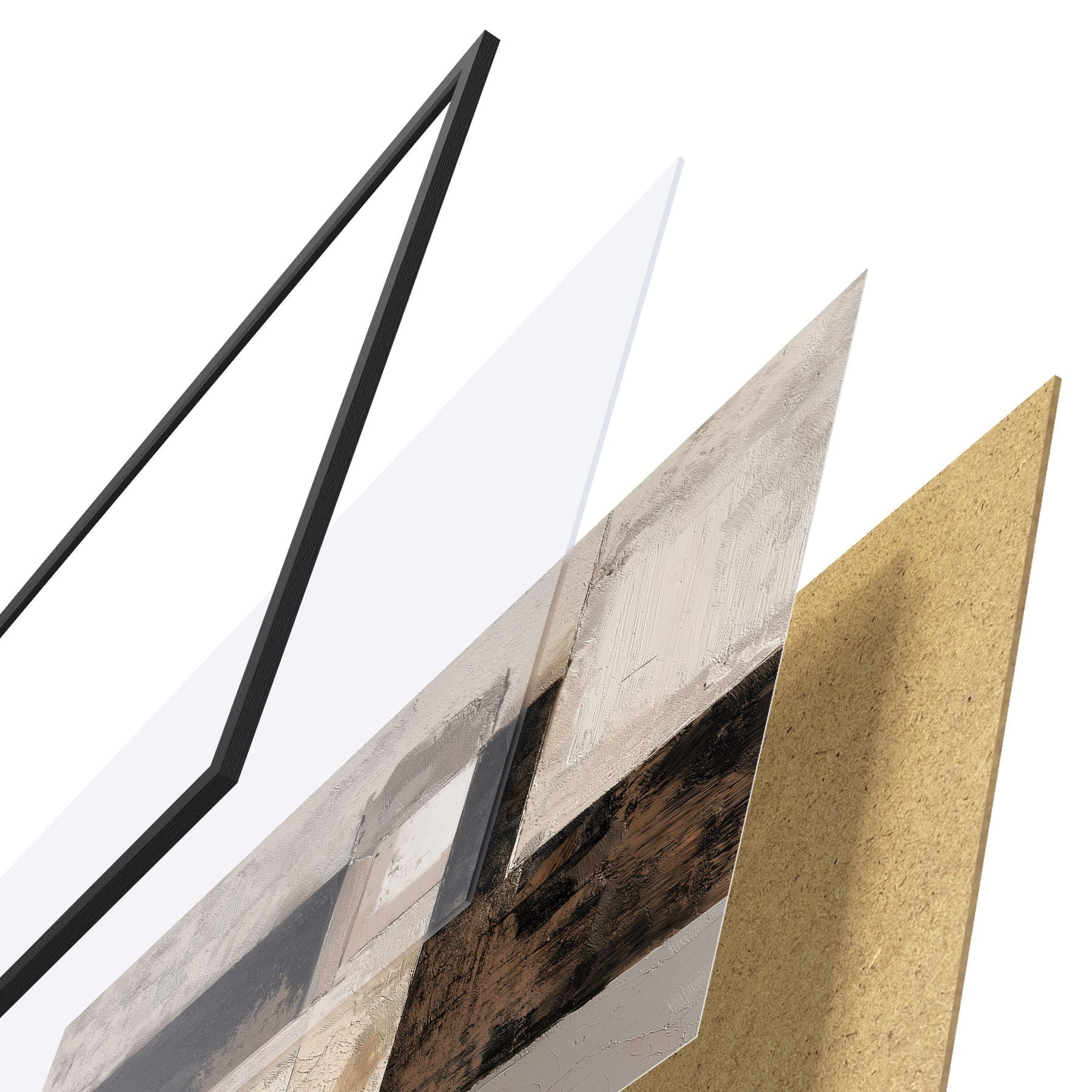 De poster bestaat uit een frame, plexiglas, geprinte afbeelding en spaanplaat achterkant. De poster kan meteen aan de muur worden gehangen dankzij de bevestigingen op de achterkant.