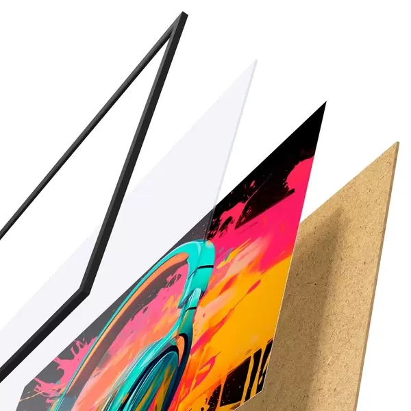 De poster bestaat uit een frame, plexiglas, geprinte afbeelding en spaanplaat achterkant. De poster kan meteen aan de muur worden gehangen dankzij de bevestigingen op de achterkant.