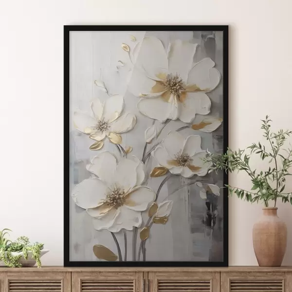 Poster Witte bloemen met gele accenten op een structuurrijke achtergrond N° f48721