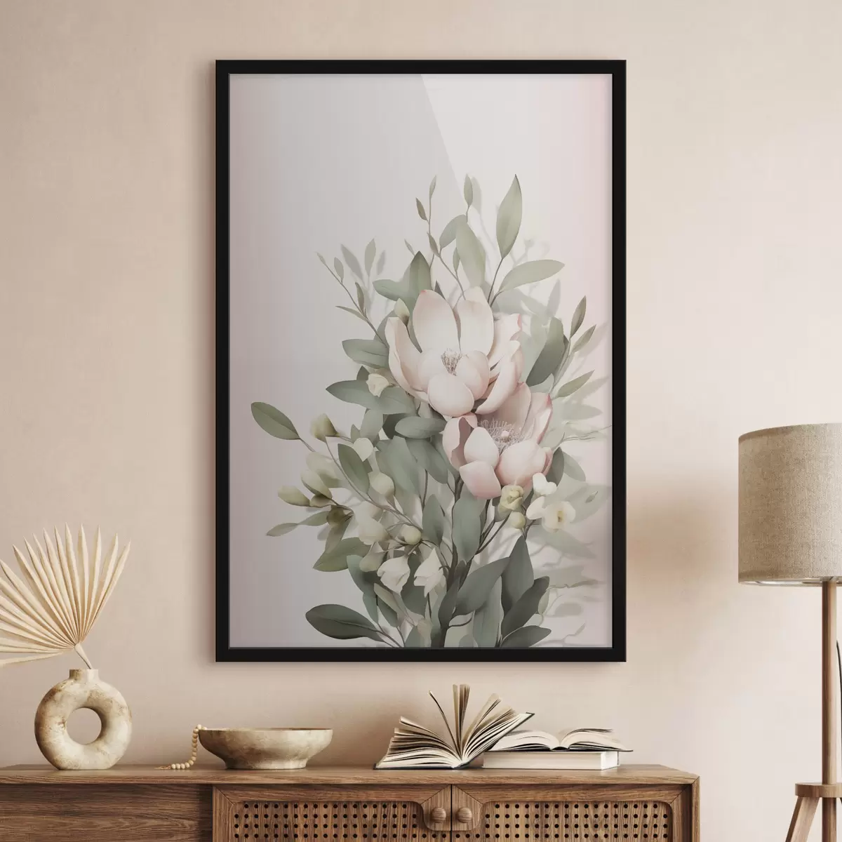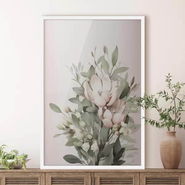 Poster Een boeket pastelkleurige bloemen met eucalyptusbladeren, op een lichtroze achtergrond N° f48728